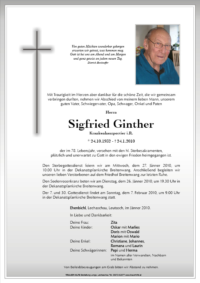13.12.1901 24.01.2010 Ehenbichl Sigfried Ginther Action Parte Sterbebild Gedenkkerzen Kondolenzen Danksagung Parte Sterbebild Gedenkkerzen Kondolenzen Danksagung Parte herunterladen Sterbebild herunterladen Gedenkkerzen für Sigfried Ginther 4 Einträge Kerze anzünden Markus Wir vermissen dich Deine Zita Deine Marion m. Familie Ihre Gedenkkerze fürSigfried Ginther Ihr Name* Farbe auswählen Ihre Nachricht oder Name* E-Mail-Adresse* Mit dem Klicken auf "Kerze anzünden" erklären Sie sich mit unseren Datenschutzbestimmungen einverstanden. Kondolenzbuch für Sigfried Ginther 0 Einträge Kondolenz verfassen Ihr Abschiedsgruß an Sigfried Ginther Ihr Name* E-Mail-Adresse* Ihre Nachricht* Mit dem Klicken auf "Gruß absenden" erklären Sie sich mit unseren Datenschutzbestimmungen einverstanden. Danksagung herunterladen
