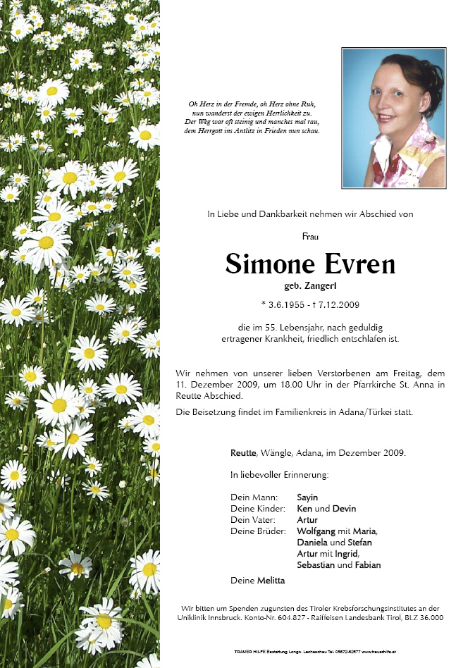 13.12.1901 07.12.2009 Wängle Simone Evren Action Parte Gedenkkerzen Kondolenzen Parte Gedenkkerzen Kondolenzen Parte herunterladen Gedenkkerzen für Simone Evren 2 Einträge Kerze anzünden für alle, die dich vermissen für alle, denen du fehlst Ihre Gedenkkerze fürSimone Evren Ihr Name* Farbe auswählen Ihre Nachricht oder Name* E-Mail-Adresse* Mit dem Klicken auf "Kerze anzünden" erklären Sie sich mit unseren Datenschutzbestimmungen einverstanden. Kondolenzbuch für Simone Evren 0 Einträge Kondolenz verfassen Ihr Abschiedsgruß an Simone Evren Ihr Name* E-Mail-Adresse* Ihre Nachricht* Mit dem Klicken auf "Gruß absenden" erklären Sie sich mit unseren Datenschutzbestimmungen einverstanden.