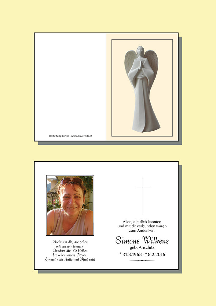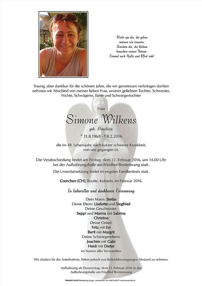 Liebe Trauerfamilie. Simone wird von allen Engeln heimgetragen. Danke dass ich dich ein kleines Stück deines Weges begleiten durfte. Elisabeth