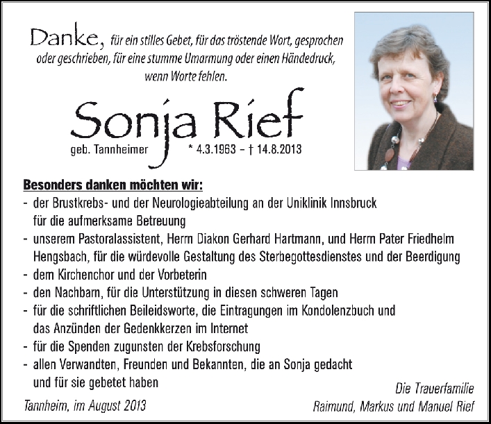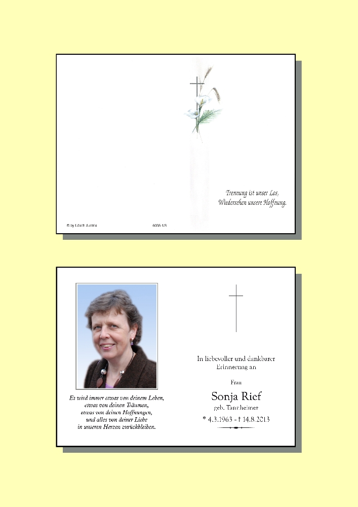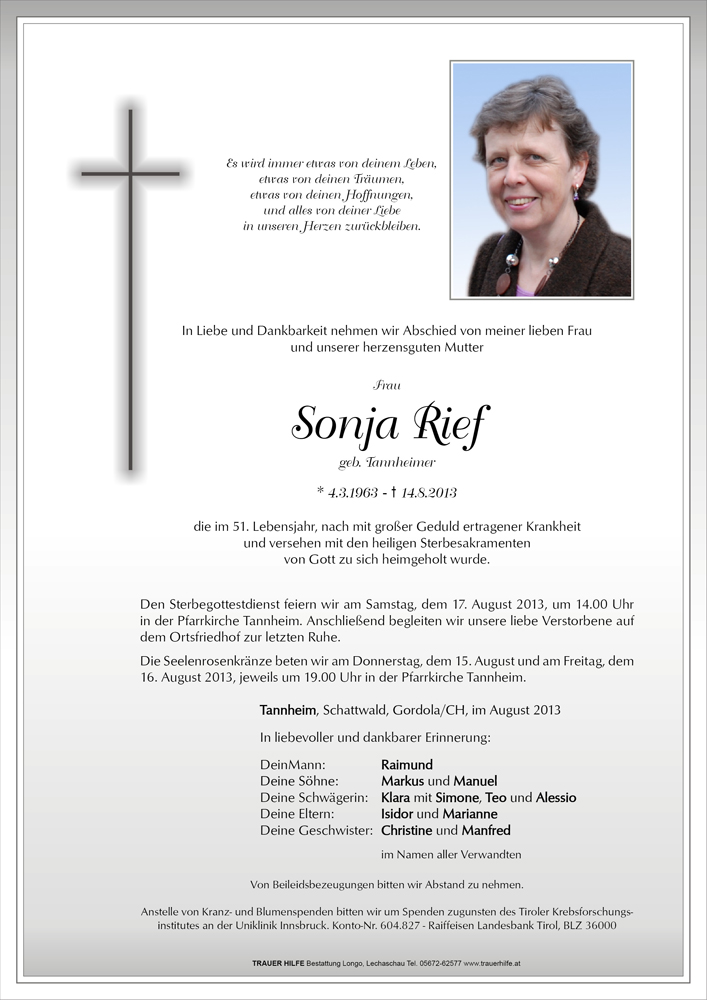 Lieber Raimund mit Marcus und Manuel! Liebe Eltern mit Geschwister!Tief erschüttert erfuhr ich von der Nachricht vom Heimgang Deiner lieben Sonja, Eurer herzensguten Mutter und Eurer geliebten Tochter und Schwester.