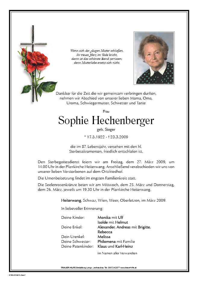 13.12.1901 23.03.2009 Heiterwang Sophie Hechenberger Action Parte Gedenkkerzen Kondolenzen Parte Gedenkkerzen Kondolenzen Parte herunterladen Gedenkkerzen für Sophie Hechenberger 3 Einträge Kerze anzünden Ruhe sanft in Gotteshand! Ruhe sanft in Gotteshand! dei Bernhardla Ihre Gedenkkerze fürSophie Hechenberger Ihr Name* Farbe auswählen Ihre Nachricht oder Name* E-Mail-Adresse* Mit dem Klicken auf "Kerze anzünden" erklären Sie sich mit unseren Datenschutzbestimmungen einverstanden. Kondolenzbuch für Sophie Hechenberger 0 Einträge Kondolenz verfassen Ihr Abschiedsgruß an Sophie Hechenberger Ihr Name* E-Mail-Adresse* Ihre Nachricht* Mit dem Klicken auf "Gruß absenden" erklären Sie sich mit unseren Datenschutzbestimmungen einverstanden.