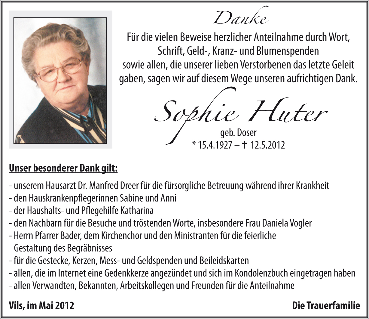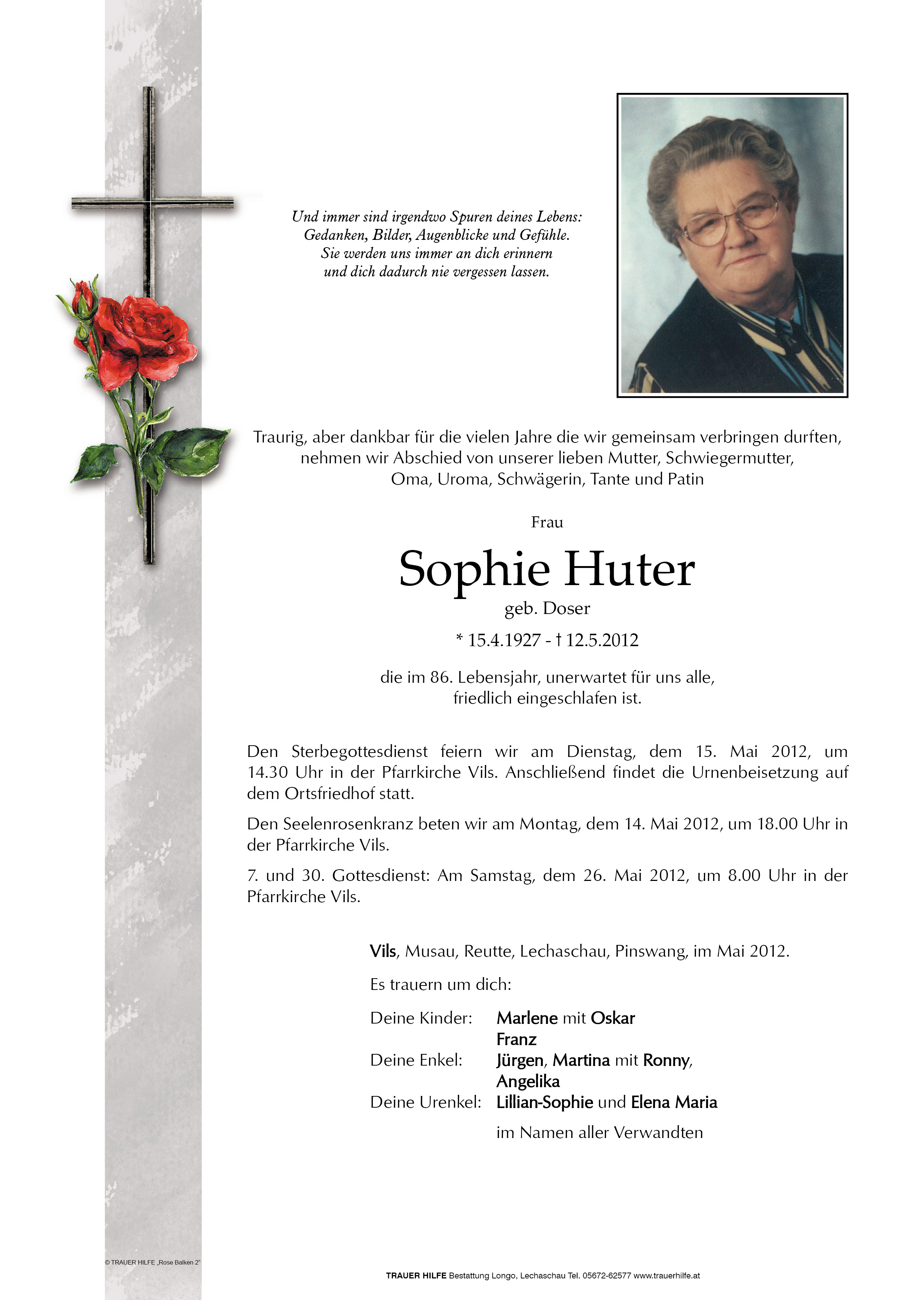 In tiefer Anteilnahme werden wir Sophie immer in guter Erinnerung behalten. Unser inniges Beileid gilt der Trauerfamilie.
