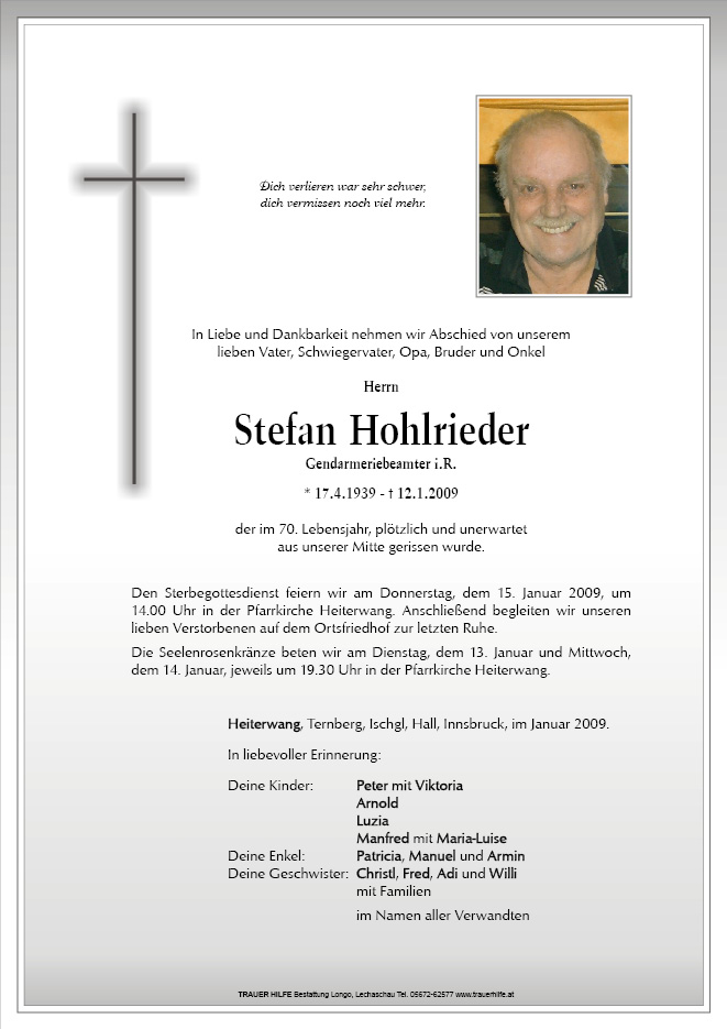 13.12.1901 12.01.2009 Heiterwang Stefan Hohlrieder Action Parte Gedenkkerzen Kondolenzen Parte Gedenkkerzen Kondolenzen Parte herunterladen Gedenkkerzen für Stefan Hohlrieder 10 Einträge Kerze anzünden Armin u. Manuel m. Mädls Mannay u. Maria-Luise Manny m. Familie Michael Dein Enkel Armin m. Verena Dein Enkel Manuel Manny u. Maria-Luise Manny m. Familie Ein Licht für deine Reise Manny Luise Armin u. Manuel Ihre Gedenkkerze fürStefan Hohlrieder Ihr Name* Farbe auswählen Ihre Nachricht oder Name* E-Mail-Adresse* Mit dem Klicken auf "Kerze anzünden" erklären Sie sich mit unseren Datenschutzbestimmungen einverstanden. Kondolenzbuch für Stefan Hohlrieder 0 Einträge Kondolenz verfassen Ihr Abschiedsgruß an Stefan Hohlrieder Ihr Name* E-Mail-Adresse* Ihre Nachricht* Mit dem Klicken auf "Gruß absenden" erklären Sie sich mit unseren Datenschutzbestimmungen einverstanden.