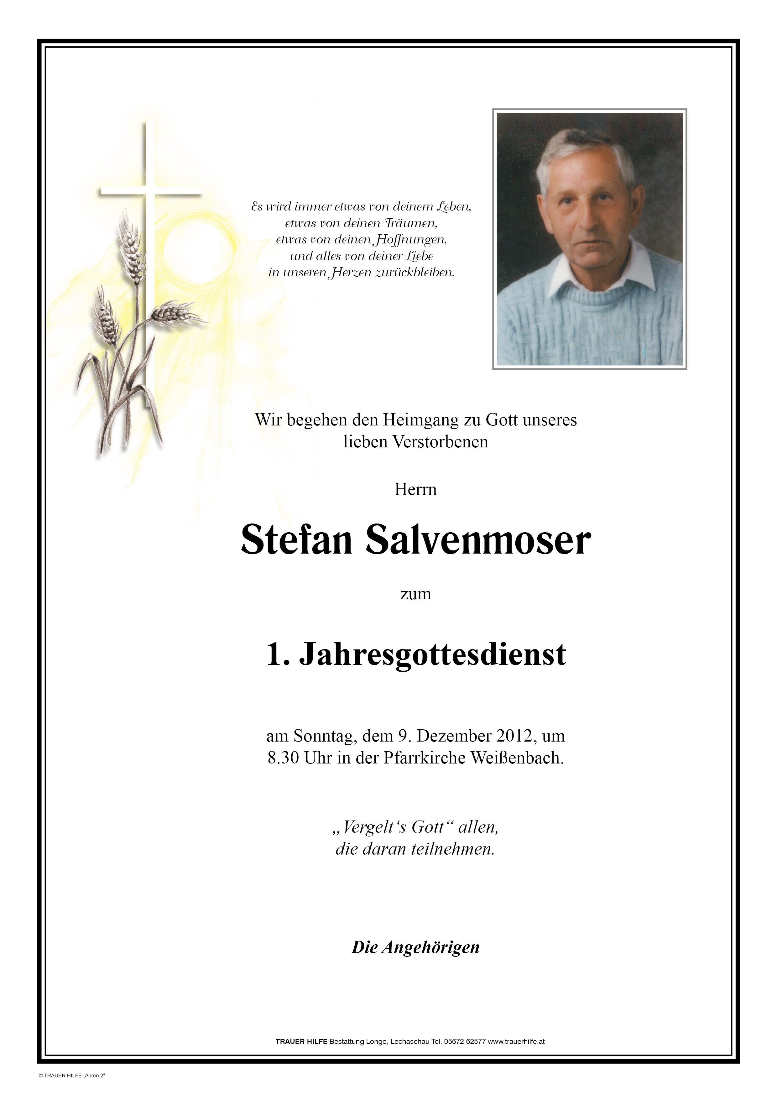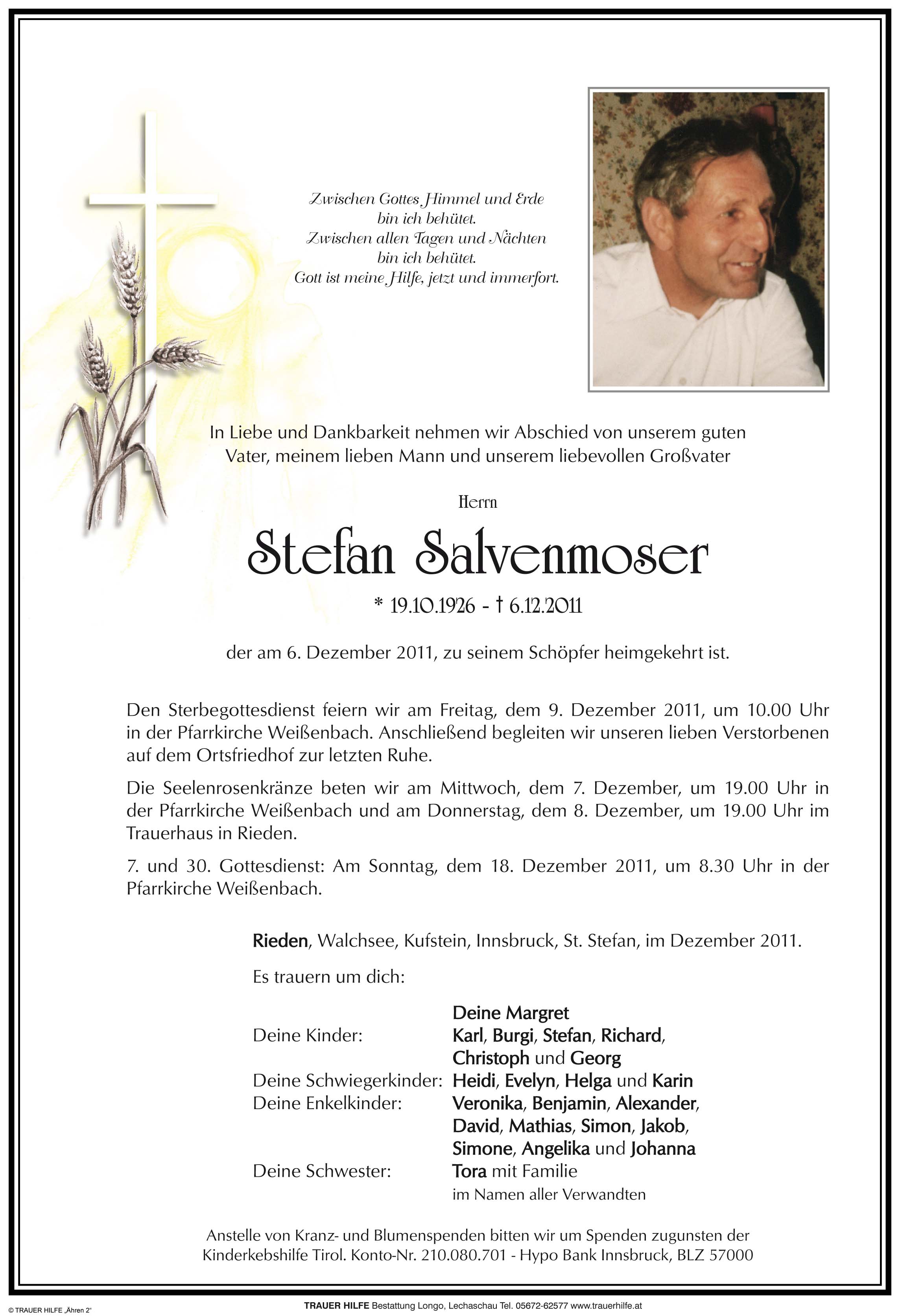 Seid nicht traurig, dass Euer Stefan zu seinem Herrn und Schöpfer heimgegangen ist. Freut Euch, dass er so lange bei Euch sein konnte.