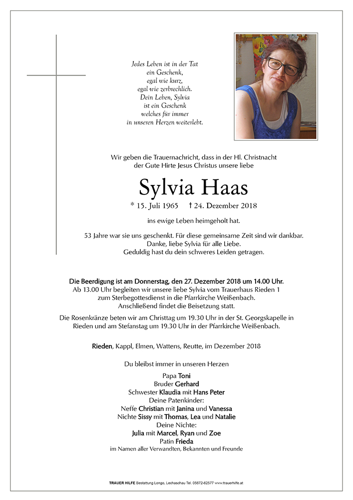 Sylvia, als geliebte Tochter, Schwester, Tante, Cousine, etc.,