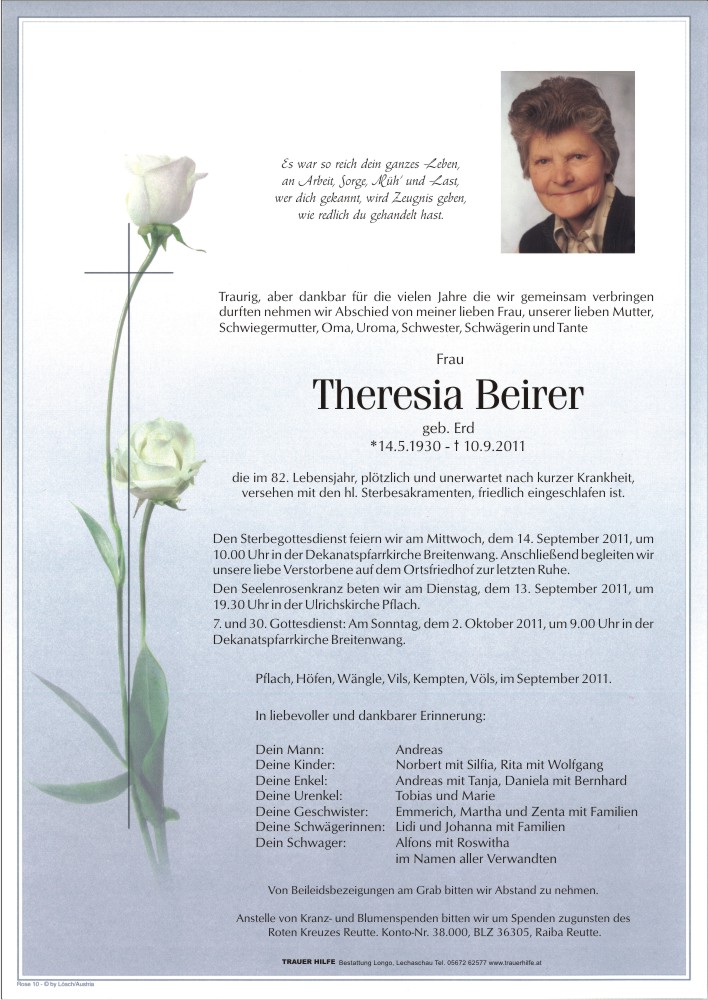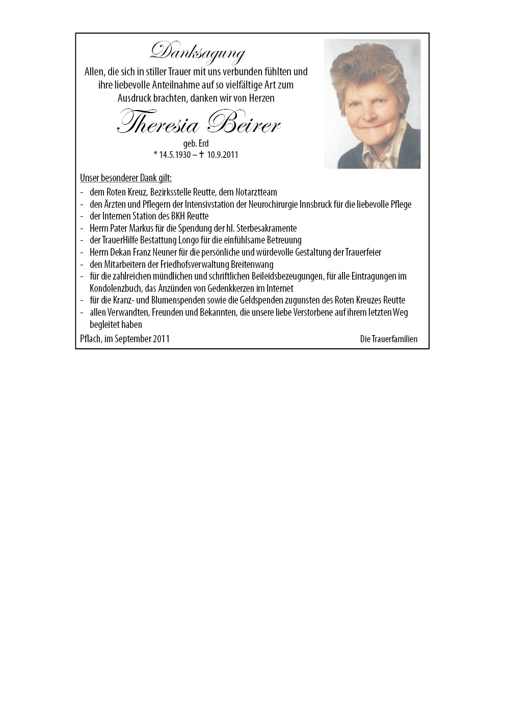 13.12.1901 10.09.2011 Pflach Theresia Beirer Action Parte Sterbebild Gedenkkerzen Kondolenzen Danksagung Parte Sterbebild Gedenkkerzen Kondolenzen Danksagung Parte herunterladen Sterbebild herunterladen Gedenkkerzen für Theresia Beirer 7 Einträge Kerze anzünden R.i.P. Ida Nardon Ein Licht für Dich Fam. Günter und Gitti Muglach Ruhe in Frieden, Gerhard Walburga und Josef Dürrhammer Renate Praxmair Ihre Gedenkkerze fürTheresia Beirer Ihr Name* Farbe auswählen Ihre Nachricht oder Name* E-Mail-Adresse* Mit dem Klicken auf "Kerze anzünden" erklären Sie sich mit unseren Datenschutzbestimmungen einverstanden. Kondolenzbuch für Theresia Beirer 0 Einträge Kondolenz verfassen Ihr Abschiedsgruß an Theresia Beirer Ihr Name* E-Mail-Adresse* Ihre Nachricht* Mit dem Klicken auf "Gruß absenden" erklären Sie sich mit unseren Datenschutzbestimmungen einverstanden. Danksagung herunterladen