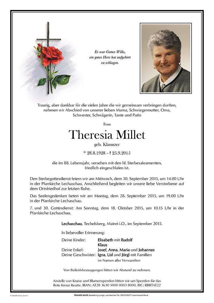 28.08.1928 25.09.2015 Lechaschau Theresia Millet Action Parte Sterbebild Gedenkkerzen Kondolenzen Parte Sterbebild Gedenkkerzen Kondolenzen Parte herunterladen Sterbebild herunterladen Gedenkkerzen fĂŒr Theresia Millet 90 EintrĂ€ge Kerze anzĂŒnden A Liachtle fe de Motas Fam. Klaunzer Mota A Liachtle vom Klaunzerberg Fam. Klaunzer Mota Fam. Klaunzer Mota A Liachtle vom Klaunzerberg Ramona und Elena Ramona und Elena Ramona und Elena Ramona und Elena Alban und Annemarie â„A Liachtle aus Matreiâ„ FĂŒr Deine Liebenâ„ Alban und Annemarie â„Pfiete, Tresl! â„ Julius Rid A Liachtle aus Matrei FĂŒr Deine Liebenâ„ â„Pfiete, Tresl! â„ Alban und Annemarie Ramona und Elena Bernhard Zaggl Fa. Paula Mandler FĂŒr Deine Liebenâ„ Wolfgang Hosp Lechaschau A Liachtle aus Matrei Fam. Petra u. Michael Fellner Familie Klotz Goldene Rose Engel mögen dich begleiten Tabelander Luis mit Fam. Lisl Thomas und Laura A Liachtle fa Di! Fam. Ernst und Elfi Gutmann Resinger Werner m. Fam. Gustl & Isabella Resinger Schmid Josefa Schmid Hubert Fam. Gangl Anna, Rainbach Bettina Friedle Anna Zojer mit Fam. Ein Licht aus Osttirol Fam. Zojer Anna Bettina Klaunzer Julius Rid Familie Luttinger-Burger Sepp und Constanze Resinger Fam. Steiner Irene Julie Leuprecht Simone Walter Schweigl Andreas Fam. Klaunzer Jörgl undLisl Lechner Andreas Trager Marlies m. Fam. Klaudia u. Reinhold Sprenger Fam. Wagner-Stöger Georg Strasser Sibylle, ehem. Schuh Koch Fam. Höfler Fam. Elfi Klaunzer Verena, ReneÂŽu. Daniel Gonn Meinrad u. Eva mit Fam. Fam. Rosmarie u. Alois Wöhry Fam. Eugen u. Charlotte Ladner Marlene Broll Martin Frick Fam. Christl Warscher Lucas Gezzele das Team des SGS-Ausserfern Waltraud Santer A Liachtle aus Matrei Fam. Reindl Karin und Hermann Fam. Unterrader Gundi Resinger David & Susanne Fam. Walter Tabelander Naz und Elke Fam. Hons Fuetsch Matrei Familie Sepp Tabelander Walter u. Lydia Schwenk Erika Wex Fam. Sylvia Gschnitzer Fam. Karl u. Maria Pellegrini FĂŒr Deine Liebenâ„ â„Pfiete, Tresl! â„ Ramona und Elena Alban und Annemarie â„A Liachtle aus Matreiâ„ Claudia, Elias und Luca Ruhe sanft Sylvia, Diana, claudi Klaunzer Peter u. Traudl Claudia Schreieck TrauerHilfe Bestattung Longo Ihre Gedenkkerze fĂŒrTheresia Millet Ihr Name* Farbe auswĂ€hlen Ihre Nachricht oder Name* E-Mail-Adresse* Mit dem Klicken auf "Kerze anzĂŒnden" erklĂ€ren Sie sich mit unseren Datenschutzbestimmungen einverstanden. Kondolenzbuch fĂŒr Theresia Millet 1 Eintrag Kondolenz verfassen Lieber Klaus,liebe Lisl Zum Heimgang eurer Mama möchten wir unser Beileid ĂŒbermitteln.Wir wĂŒnschen euch Kraft und Segen. Klaunzer Peter mit Familie klaunzer jasmina 29.09.2015 um 20:46 Uhr Ihr AbschiedsgruĂ an Theresia Millet Ihr Name* E-Mail-Adresse* Ihre Nachricht* Mit dem Klicken auf "GruĂ absenden" erklĂ€ren Sie sich mit unseren Datenschutzbestimmungen einverstanden.