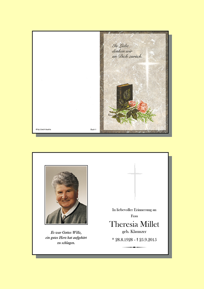 Lieber Klaus,liebe Lisl Zum Heimgang eurer Mama möchten wir unser Beileid ĂŒbermitteln.Wir wĂŒnschen euch Kraft und Segen. Klaunzer Peter mit Familie klaunzer jasmina 29.09.2015 um 20:46 Uhr