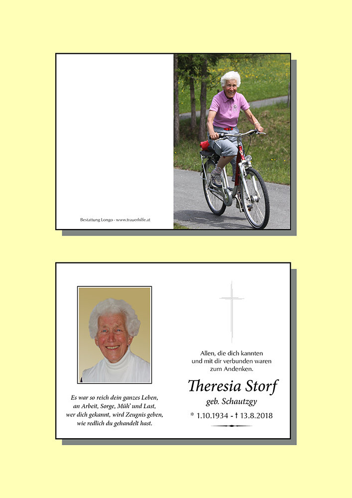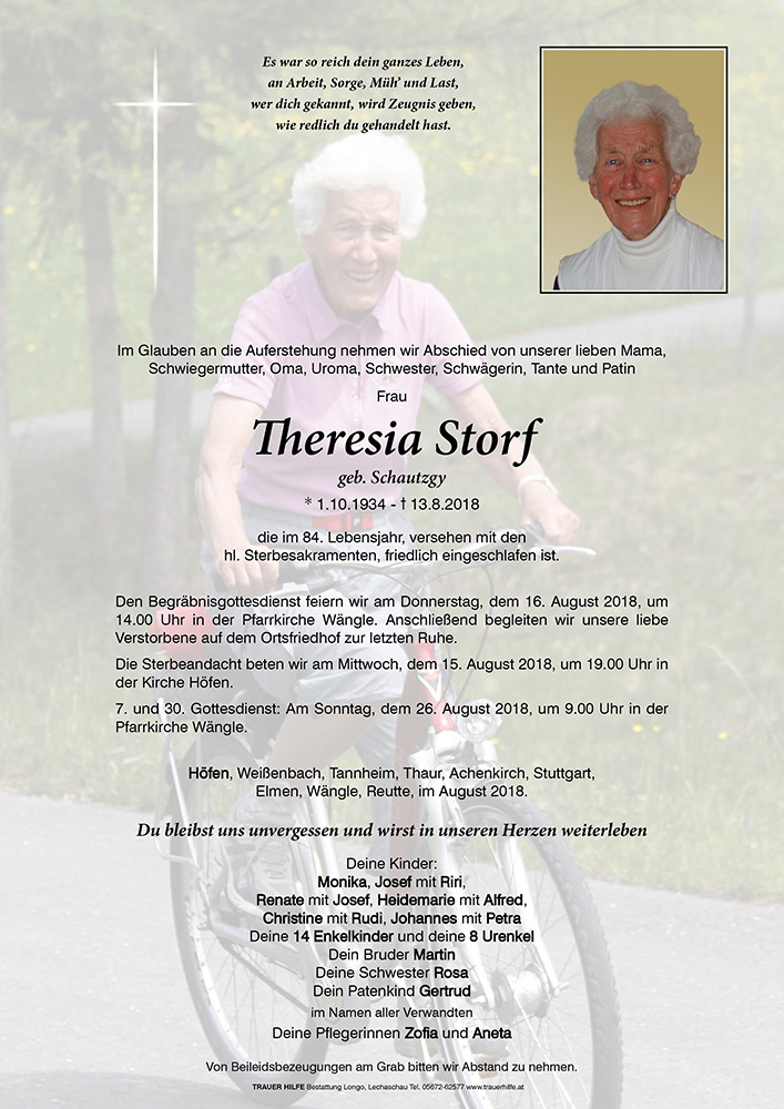 Liebe Familie Storf, ich habe eure Mama und Oma oft bewundert, wie sie grüßend vorbei geradelt ist, Jahr für Jahr lächelnd, mit ihrer feinen, ruhigen Art.