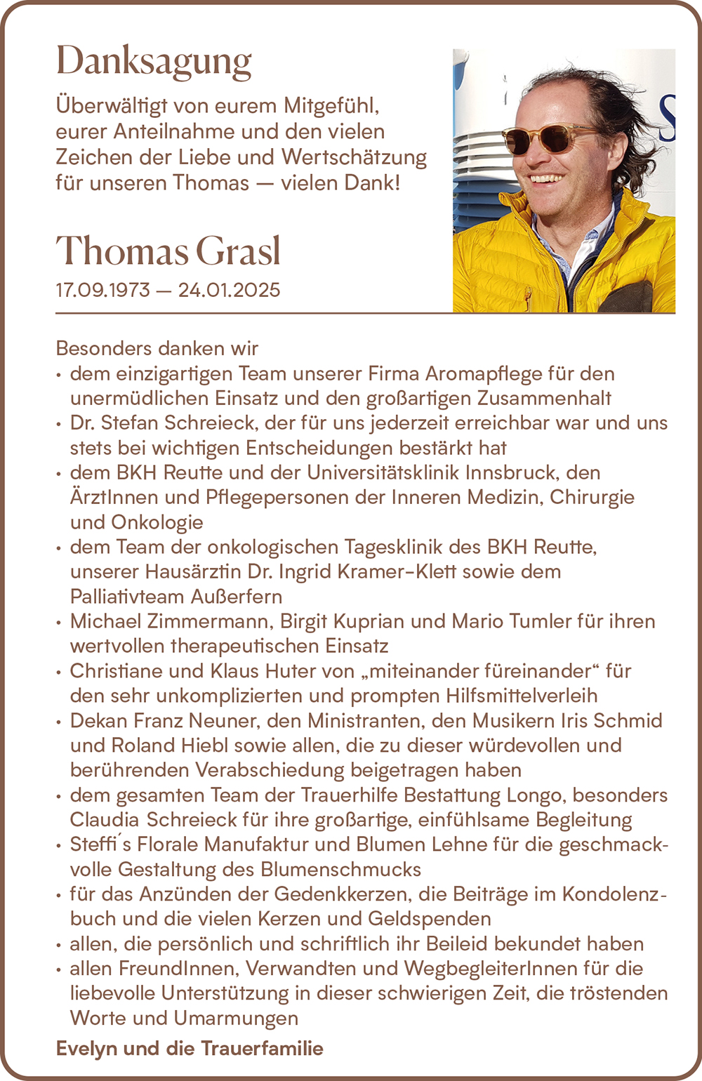 Tief erschüttert möchte ich euch meine Aufrichte Anteilnahme entbieten und wünsche euch ganz viel Kraft in diesen schweren Stunden des Abschieds und der Trauer. Die Harmonie und Liebe zwischen euch war unübersehbar und Thomas war mit seiner äußerst freundlichen Art und seinem Wesen einfach ein wunderbarer Mensch. Mögen die vielen schönen Erinnerungen euch allen bald wieder ein Lächeln ins Gesicht zaubern und lasst ihn bei euch sein, als wäre er nie gegangen.