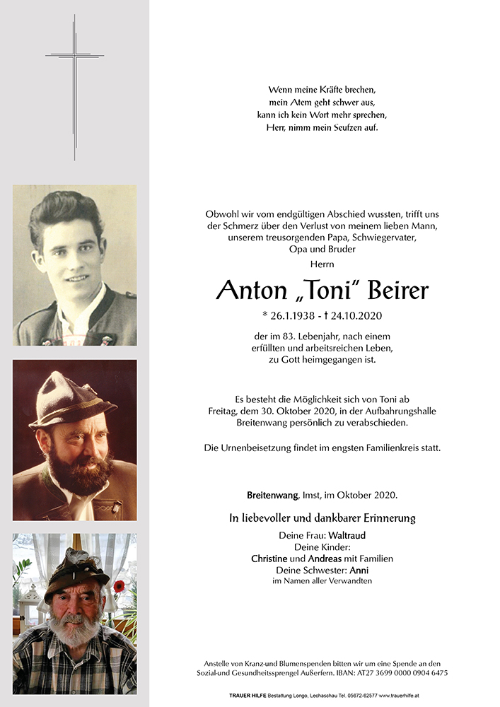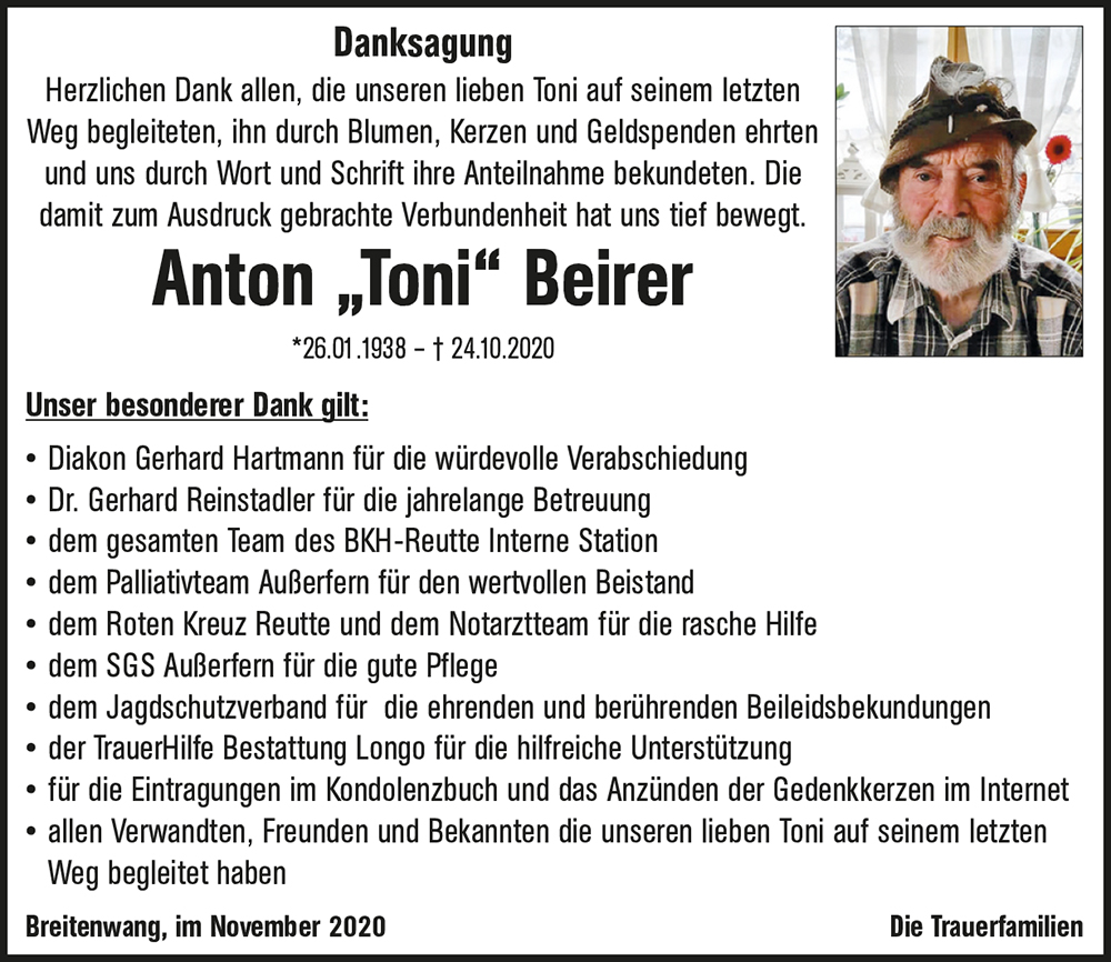 Der Jagdschutzverein 1875, Bezirksgruppe Reutte, verabschiedet sich, mit großem Respekt und letztem Weidmannsdank von Toni Beirer. Toni war jahrzehntelang Mitglied, und viele Jahre Delegierter zur Landesvollversammlung unseres Vereins. Toni bleibt uns aber immer, mit seinen an Wildererromantik erinnernden ,packenden Erzählungen in Erinnerung. Prägend war dabei, sein ,ihn immer begleitender Zahnstocher. Toni du warst ein Original.