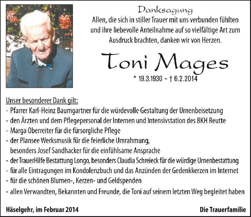 19.03.1930 06.02.2014 Häselgehr Toni Mages Action Parte Sterbebild Gedenkkerzen Kondolenzen Danksagung Parte Sterbebild Gedenkkerzen Kondolenzen Danksagung Parte herunterladen Sterbebild herunterladen Gedenkkerzen für Toni Mages 58 Einträge Kerze anzünden Senioren Häselgehr Senioren Häselgehr Seniorenbund Häselgehr Ruhe in Frieden! Zum Jahresgedenken! Fam. Günter u. Gitti Muglach Fam. Lageder- Weißenbach Senioren Häselgehr TSB OG Häselgehr Ein Licht für deinen Weg Fam. Laugus Ruhe in Frieden ruhe in frieden k. mit fam Letzte Grüße, Kathi Familie Sperlich Barbara, Sepp u Marie Fam. Wehrmeister Anita und Josef Walch-Lang Uhrmacher´s Erich Wilfried + Angelika Hammerle Reinhold Heiserer Rosmarie Hammerle Edith, Othmar und Gerhard deine nachbaren steffi-rudi. Olga mit Fam. Familie Weißenbach Gerd Hannelore Lochbihler Lorenz Kurt Fam. Elmar Lang Fam. E. Lechleitner Ruhe in Frieden Fm. Hauser Ebele gerhard und Monika Lang Karl u. Ingrid Fam. Michael u. Waltraud Hosp Heike, Rainer und Janine Helene Alois Sonnweber Weißb Ruhe in Frieden Liebe und Licht für dich Seifert Hildegard mit Familie Andreas und Claudia Berni und Schorsch Licht und Frieden hosp josef Brigitte u. Othmar Babl . . . ruhe in Frieden. . . Fam. Kößler Werner Georg Hundertpfund Scheidle Roland m. Fam. Isabell Fam. Stefan Beirer Ruhe in Frieden Siegfried u. Burgi Zotz mit Fa Bernhard und Christine Helfer Gerhard Dreier Ruhe in Frieden Das ewige Licht leuchte dir Margit Scheucher TrauerHilfe Bestattung Longo Ihre Gedenkkerze fürToni Mages Ihr Name* Farbe auswählen Ihre Nachricht oder Name* E-Mail-Adresse* Mit dem Klicken auf "Kerze anzünden" erklären Sie sich mit unseren Datenschutzbestimmungen einverstanden. Kondolenzbuch für Toni Mages 2 Einträge Kondolenz verfassen Ruhe in Frieden !! Fam Kaufmann 10.02.2014 um 21:58 Uhr ruhe in frieden.bei deiner gerda.. rudi steffi 09.02.2014 um 19:06 Uhr Ihr Abschiedsgruß an Toni Mages Ihr Name* E-Mail-Adresse* Ihre Nachricht* Mit dem Klicken auf "Gruß absenden" erklären Sie sich mit unseren Datenschutzbestimmungen einverstanden. Danksagung herunterladen