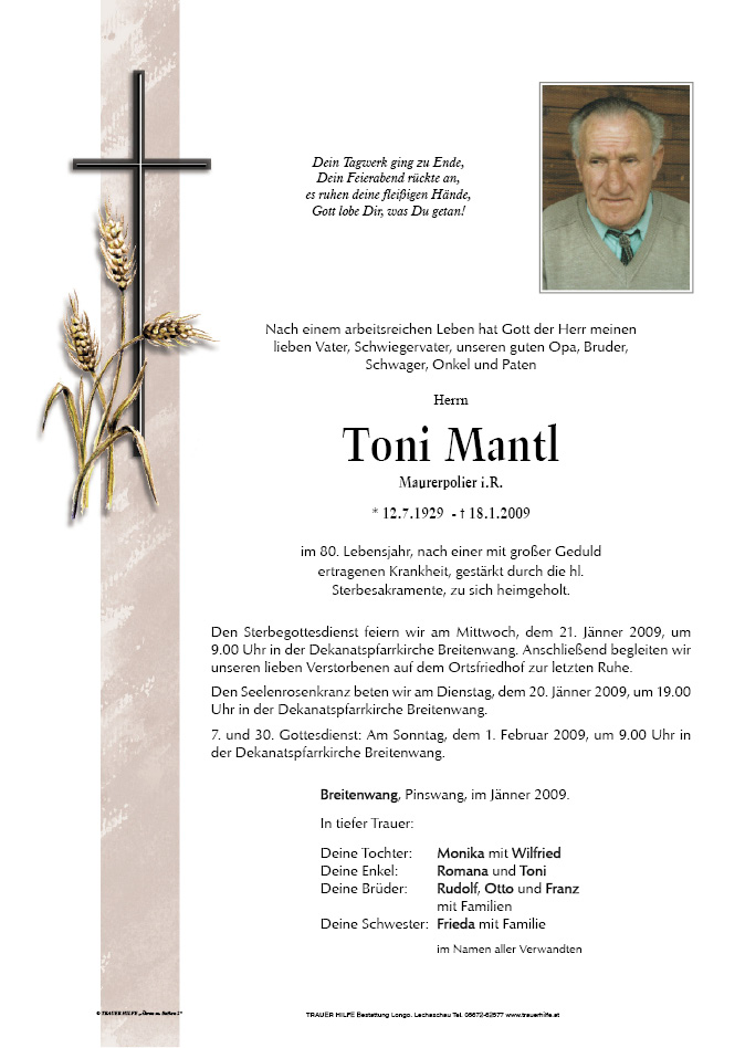 13.12.1901 18.01.2009 Breitenwang Toni Mantl Action Parte Gedenkkerzen Kondolenzen Parte Gedenkkerzen Kondolenzen Parte herunterladen Gedenkkerzen für Toni Mantl 2 Einträge Kerze anzünden Ruhe in Frieden Roland u. Karin Hohenrainer Ihre Gedenkkerze fürToni Mantl Ihr Name* Farbe auswählen Ihre Nachricht oder Name* E-Mail-Adresse* Mit dem Klicken auf "Kerze anzünden" erklären Sie sich mit unseren Datenschutzbestimmungen einverstanden. Kondolenzbuch für Toni Mantl 0 Einträge Kondolenz verfassen Ihr Abschiedsgruß an Toni Mantl Ihr Name* E-Mail-Adresse* Ihre Nachricht* Mit dem Klicken auf "Gruß absenden" erklären Sie sich mit unseren Datenschutzbestimmungen einverstanden.