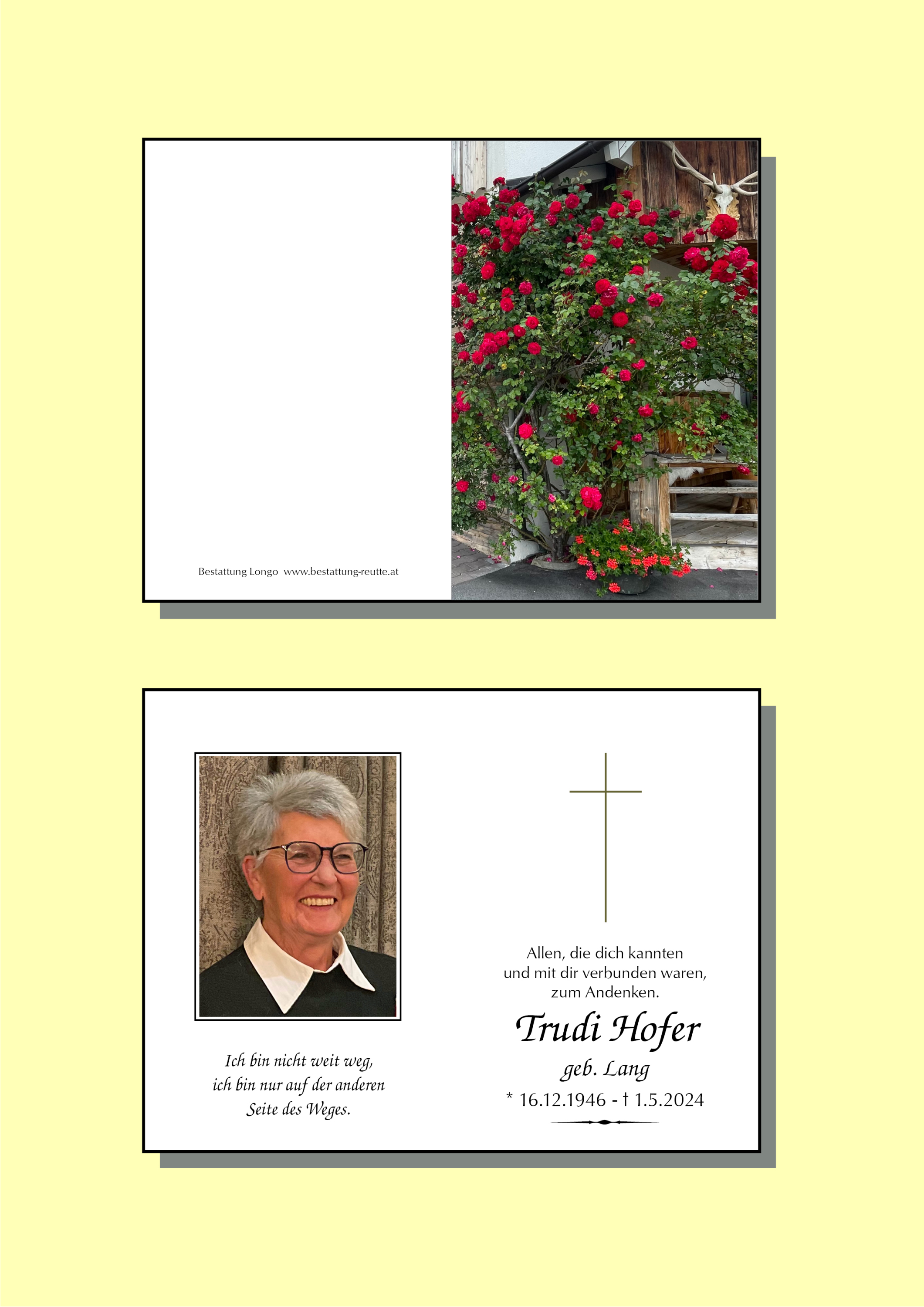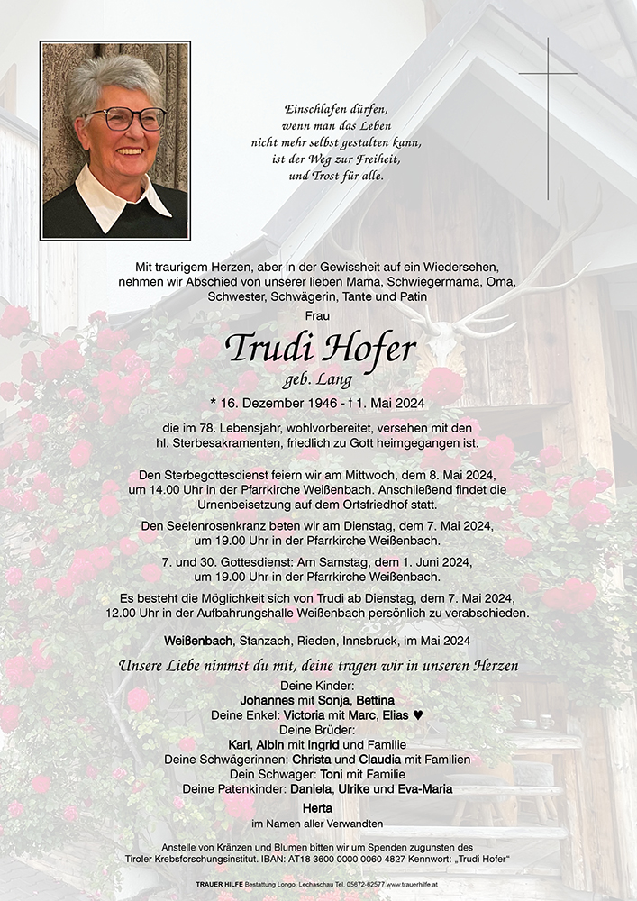 Für jede Träne ein Lachen, für die Sorgen eine Aussicht und eine Hilfe für jede Schwierigkeit. Für jede Bürde, die das Leben schickt, einen ehrlichen Freund zum Reden und das Schicksal zu teilen, für jede Spur die eure Trudi hinterlassen hat einen guten Gedanken an sie, für jeden Seufzer ein schönes Lied und eine Antwort auf jedes Gebet. Für Trudi den Frieden und Herzen die ihr ein würdiges Andenken bewahren.