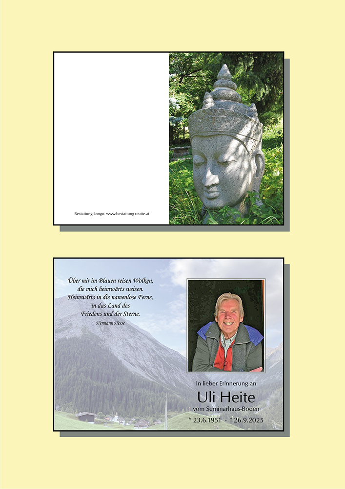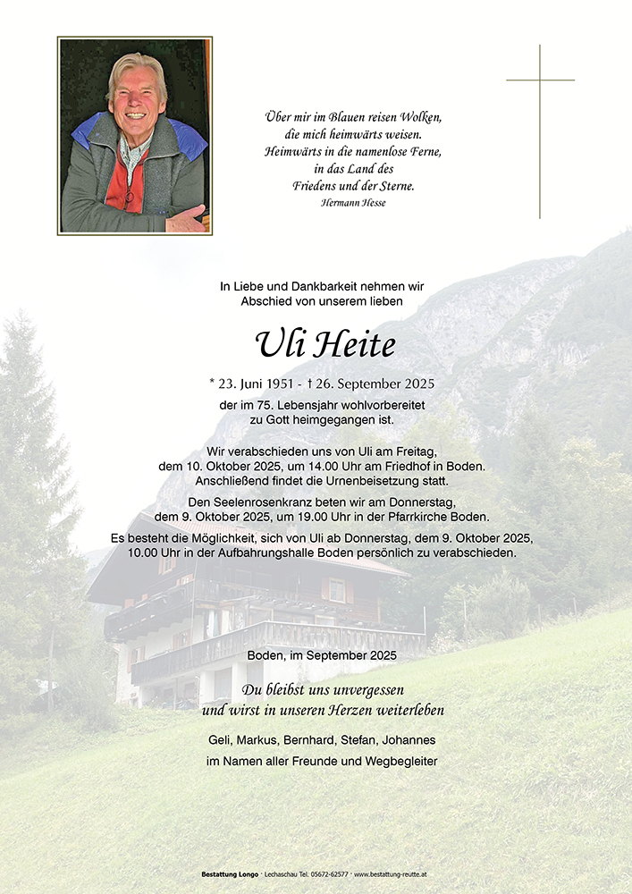 23.06.1951 26.09.2025 Boden Uli Heite Action Parte Sterbebild Gedenkkerzen Kondolenzen Parte Sterbebild Gedenkkerzen Kondolenzen Parte herunterladen Sterbebild herunterladen Gedenkkerzen für Uli Heite 40 Einträge Kerze anzünden Uli ich denk an Dich Fam. Maldoner-Jäger Ruhe im Licht und im Frieden - Petra und Maxi Bettina Kärle Roland Baisch Danke die für Vieles! Pfiat di Uli, du warst ein feiner Mensch! Ulli und Werner Wolf Ruhe in Frieden Gabi Goth Ruhe in Frieden Bischof Rosmarie Familie Anton Specht Viel Kraft allen, die dich vermissen Ruhe in Frieden ? Stiller Letzter Gruss Hoamatl Höfen.Mayr Ein Licht für deine Reise a Lichtl f oi unsere Lieben im Himmel? Ruhe in Frieden Ein Licht aus Pflach a Liachtl für dich ? Thomas und Evelyn Friedl Ruhe in Frieden In lieber Erinnerung, Anne und Peter Köck Dietmar mit Familie Ruhe in Frieden, Andreas Angerer mit Familie Ruhe in Frieden Elli Köpfle-Holl Ruhe in Frieden Elisabeth Lechleitner Ein Licht aus Höfen Stefan Angerer m. Familie Manfred und Hanni Mages Mario und.Barbara Rief Ah Lichtl für die u Alle im Himmel Helft Koch Doris mit Markus ? Ruhe in Frieden Marcel Heel mit Familie Ein Licht aus Höfen Kornelia Thomas mit Familie, Bschlabs Othmar Friedl mit Familie Claudia Schreieck TrauerHilfe Bestattung Longo Ihre Gedenkkerze fürUli Heite Ihr Name* Farbe auswählen Ihre Nachricht oder Name* E-Mail-Adresse* Mit dem Klicken auf "Kerze anzünden" erklären Sie sich mit unseren Datenschutzbestimmungen einverstanden. Kondolenzbuch für Uli Heite 0 Einträge Kondolenz verfassen Ihr Abschiedsgruß an Uli Heite Ihr Name* E-Mail-Adresse* Ihre Nachricht* Mit dem Klicken auf "Gruß absenden" erklären Sie sich mit unseren Datenschutzbestimmungen einverstanden.