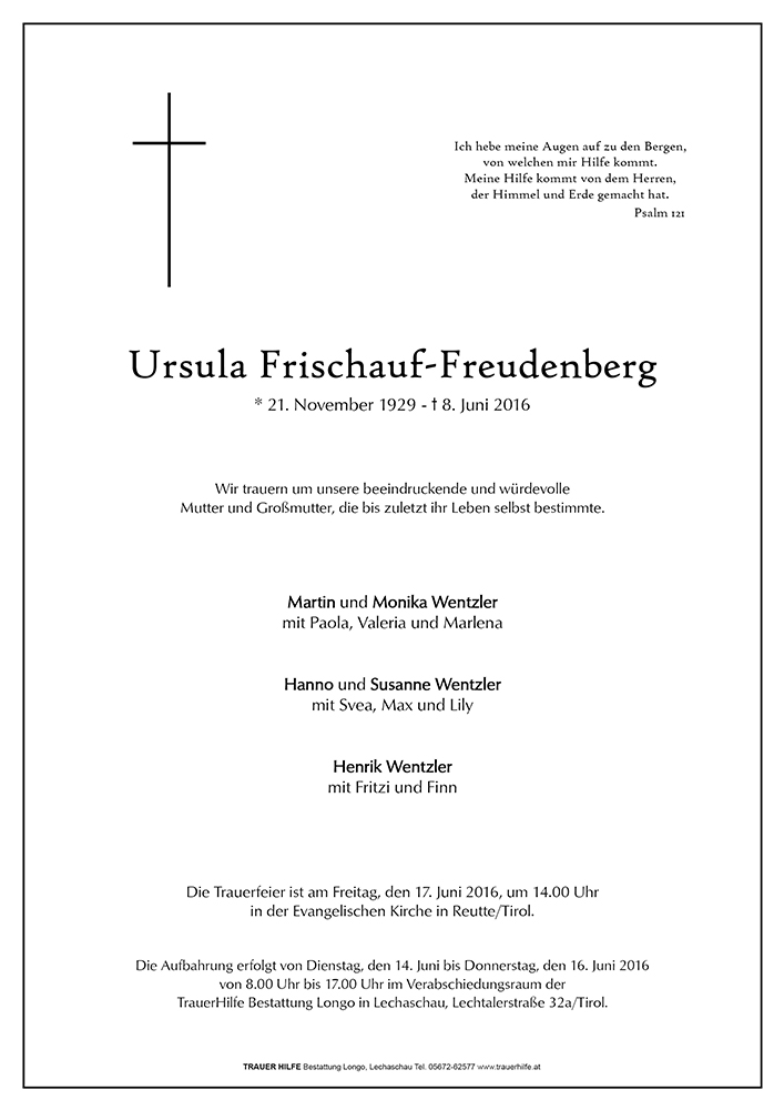 Zum so plötzlichem Tode von Frau Ursula Frischauf Freudenberg entbieten wir unsere von Herzen kommende aufrichtige Anteilnahme!