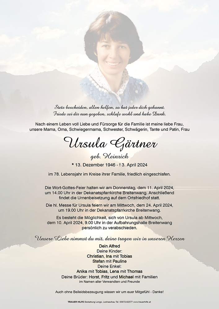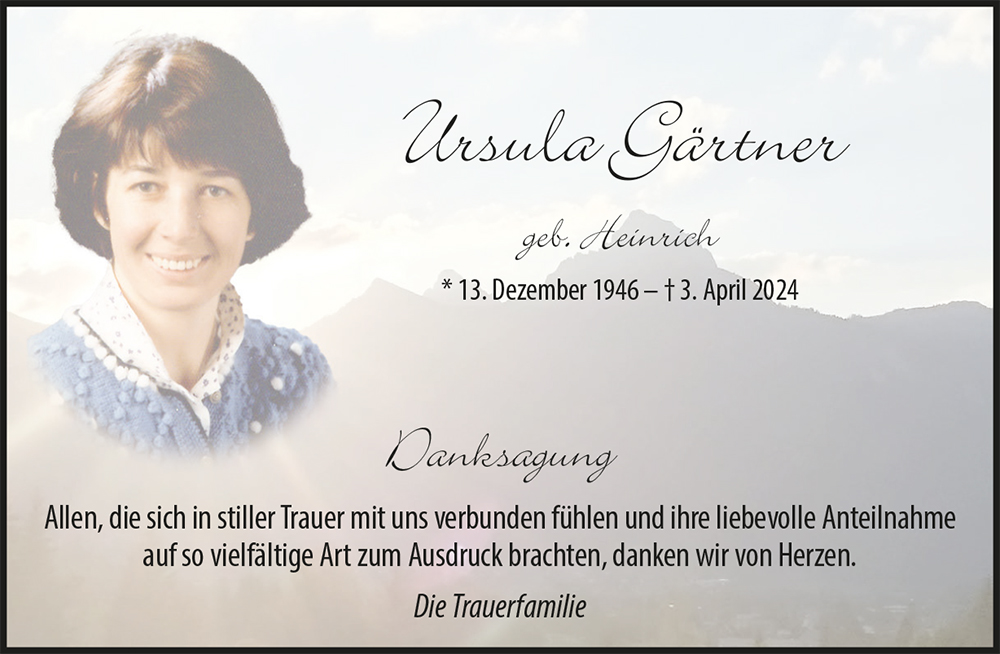 13.12.1946 03.04.2024 Breitenwang Ursula Gärtner Action Parte Sterbebild Gedenkkerzen Kondolenzen Danksagung Parte Sterbebild Gedenkkerzen Kondolenzen Danksagung Parte herunterladen Sterbebild herunterladen Gedenkkerzen für Ursula Gärtner 317 Einträge Kerze anzünden Brigitte und Hermann Hartmann zum Jahrtag Roland & Greti Zum Jahresgedenken Walburga H&H Felsberger Ruhe in Frieden - Markus Meier Silvia u. Hermann Stiller Letzter Gruss Hoamatl A.I. mayr Ruhe in Frieden Wolfgang Huter und Monika Adler H&H Felsberger Sabina Beirer Angela & Sabine Grubelnik fam. ute u.sepp pohler Thomas und Martina Moosbrugger Holzgau Mario Wolf Familie Hans Pacher Maria und Fritz Gebhard Familie Gapp Michaela (Schretter) Klaus Winkler - Transporte Hengg Melli Proeger Angelika Pohler Eva-Maria Karl Martha Wörle Familie Sigrid und Christian Angerer Ginther Silvia und Jürgen Manuela & Norman Wankmiller Fam. Gerti und Erwin Malleier Fam. Hannes Wagner Andreas Lutz Michael Kerle Mina Stürzl Jürgen + Rowitha Schatte Fam. Sigrid Weirather , Höfen EVI\'S FENSTERLADELE Evi Hagleitner mit Familie Irmi Kuisle mit Familie Ruhe in Frieden, Lintner Klaus Ramona mit Janine und Luisi Müller In lieber Erinnerung Brigitte Wasle Fam. Kalle und Nadja Eberle Fam. Claudia u. Andreas Malleier Gerfried und Sieglinde Breuss Familie Ernst J. Messmer & Kirsten Sonja Rudolf Sandra und Fredi Fam. Josef u. Rosy Kohler u. Fam. Hofer Renate Engel mit Familie Irmgard Pfanner Ruth und Franz Kathrein Fam. Mario und Marion Fasser Anita Bertlmann Hilde Deutsch Dani und Frank mit Kinder Martin Magauer Helga Lechleitner Stiller Letzter Gruss Hoamatl A.I. mayr Doris Pohler mit Fam. Fam. Andrea und Raimund Ertl Paul Rimml Werner und Helga Angerlechner Alexander Ammann Barbara Wörle Fam. Hermann Breithuber, Breitenwang Gottfried Atzenhofer Gerd und Sieglinde Wilhelm Ruhe in Frieden - Markus Meier Sigrid und Paul Zeller Keller Thomas Maria Bader, Reutte Hannes und Barbara Pirschner Evi Steiner Fam. Lolly und Manfred Saurer Andreas Schautzgy Silvia Gschwandtner Christine Strauss Dunja Kuisle Hans Weilharter Fam. Anni und Adolf Egger Reinhold Heiserer Wagner Brigitta Jutta und Andreas Kirchmair Fam. Eva u. Martin Hosp Fam. Eva u. Martin Hosp Gerda u. Fritz Bubendorfer RIP.Werner und Karin Kößler ?? Stefan Außerhofer Klaus Rudigier Wolfgang Hosp Lechaschau/Pfronten Fam.Stefan Beirer Silvia und Michael Häsele Fritz und Hilde Hosp Tanja und Boris Gundolf Melbler Johann Hildegard Schmidhofer Barbist Martin und Yvonne Michi Dreer In lieber und dankbarer Erinnerung Marlies B. Hermann Dablander Waltraud und Christian Müller Fam. Franz und Angelika Lederle Peter Vögele mit Familie Maria & Sepp Rantscher Nadine und Timo Peter und Christine Müller Fam. Sabine Raunegger Fam. Johannes und Gudrun Baumann Fam.Sylvia Gschnitzer R.I.P Elisabeth Lipp Pete Lang mit Familie Renate u.Franz Reinisch Brigitte Fuchs Edith Gärtner Irmgard u. Paul Angerer Claudia Pallhuber Conny und Franz Leitner Rita Paulweber Fam. Heini Gruber ✨Claudia und Christoph Scheucher Ruhe in Frieden Wolfram und Renate Vindl In stillem Gedenken Hanspeter Wagner Horst und Betina Reinpold Rieder Christa Maldoner Hubert Fam. Michael & Sarah Dreer Veronika Bacher Martin und Simone Klotz Walter & Margret Burkert,Ruhe in Frieden Elfriede Huber Renate Aigmann (Hold) Antonia Strauß Poppler Renate mit Fritz Eberharter Peter und Anita Michaela & Herbert Suitner Ginther Johannes mit Familie R.I.P. Eva Höllrigl Hans, Renate und Thomas Horch Letzte Grüße aus Ehrwald Fam. Paul und Veronika Kerber Klaus und Isabella Ziernhöld Fam. Bernhard Zaggl Gerhard und Anna Maria Lederle Marga Hackl Paul&Adele Strolz Gerti Ennemoser Fam. E. Schmid Margit Ralser Christian und Cornelia Josi Annemarie & Bruno HAUG Dietmar Berktold Paul Seitz mit Familie Christoph Hosp Eugen Winkler sen. Brigitte Bauer Manfred & Trixi Kerber Bettina & Jasmin Kleiner ? R.I.P. Robert und Christl Leismüller Elfi Wegmann Walter und Bärbel Hosp Fam. Karl u. Maria Pellegrini Familie Luise Werth Gabi Priemer Sinka und Gerd Leitner Pflach Ruhe in Frieden - Sandra Gruber Hans und Claudia Grißmann Fam. Andrea und Peter HOLD Herzliche Anteilnahme Maria Müller Bichlbach Fam.Klaus Kleiner Elfriede und Hannes mit Familie Fam. Karin & Patrick Babl Team des SGS Ausserfern Michael und Edelgard Steiner Horst Weirather Aufrichtige Anteilnahme Edmunda Hosp In lieber Erinnerung Karin Schretter Manfred Lettenbichler Haller Petra Aufrichtige Anteilnahme,Fam. Weirather-Talhof Dagmar und Hermann Melekusch A Lichtle aus Reutte ? Bettina & Gerhard mit Michael und Martin Familie Anton Specht Gerfied und Ingeborg Mayr Toni Pfanner Wolfgang Huter und Monika Adler Sigl Reini und Susi mit Kinder Ruhe in Frieden Ruhe in Frieden Christine Plosinjak m.Fam Margit Dablander Elisabeth Schubert mit Familie Hab Dank für alles Tante Angelika und Katharina Schrenk Sabine Ennemoser Elfriede und Willi Moser Andreas Schweigl Wolfgang Kramer mit Anja Fam. Andreas Wiesenegg Fam. Joe & Babsi Vögele Fam. Edi und Margrit Ammann Wagner Georg mit Familie Ramona und Christian Praxmair Fam Helmut und Gitti Hofherr Fam.Thomas und Christine Hackl Alexandra u. Ralph Kunze mit Familie Doris Wex und Romana Ginther Susi Fam. Mantl Bernhard & Gabi Daniela Schalk? Annelies u. Benno Wiesinger Hannes Dischl Silke Schweißgut (Ernst) Karoline u. Wolfgang Sojer Beate Jäger Christine Weilharter Fam. Michaela Kerber Simone und Josef Semmler mit Familie In lieber Erinnerung Verena & Helmuth Eugen Winkler jun. Fam. Martina & Dietmar Storf Fam. Eugen und Charlotte Ladner Fam. Patrizia u. Robert Wagner Fam. Irmgard & Matthias Rief Harald Huber mit Familie Herzliches Beileid Anke Loh Patricia Wörle Fam. Franz-Rudi u. Annelies Angerer Ludwig & Christiane Metzler Fam.Höfler Andreas Margreth Rauth Fam. Christiane Ralser S Joachim Eisele Kurt u. Edeltraud Wagner Werner Kerber Beirer Annemarie Fam. Anja und Günter Wagner Walburga Dürrhammer (Beirer) mit Familie Fam. Mages Doris und Thom