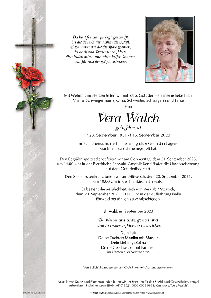 Der Liebe Gott hat Vera von ihrem Leiden erlöst und wir wünschen ihr eine gute Reise in die Ewigkeit. Euch aber wünschen wir viel Kraft und Stärke für die kommende schwere Zeit. In Gedanken sind wir bei euch Gerlinde und Hansi