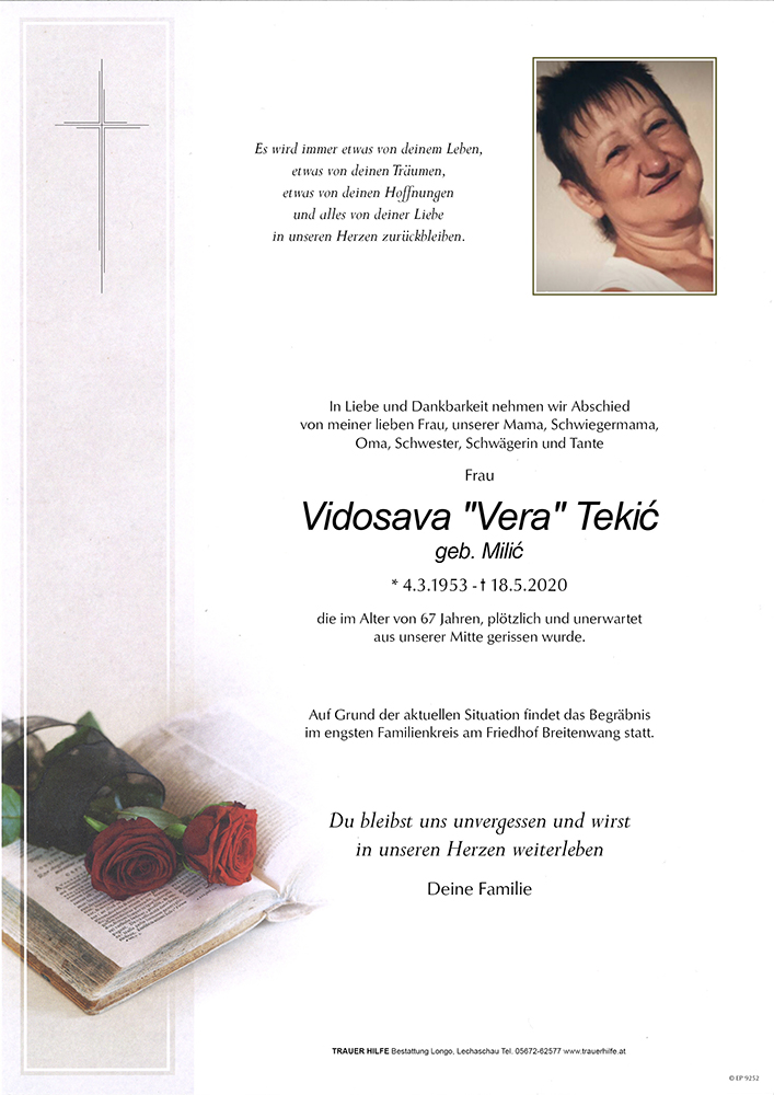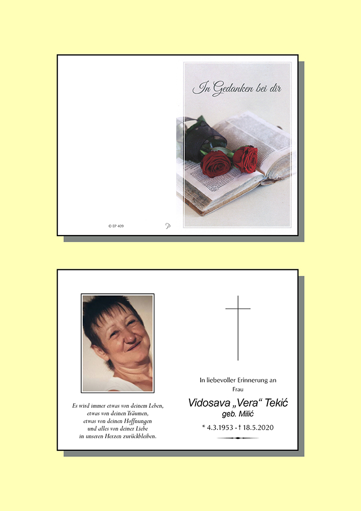 04.03.1953 18.05.2020 Reutte Vidosava Tekic Action Parte Sterbebild Gedenkkerzen Kondolenzen Parte Sterbebild Gedenkkerzen Kondolenzen Parte herunterladen Sterbebild herunterladen Gedenkkerzen für Vidosava Tekic 28 Einträge Kerze anzünden Fam. Walter & Liane Lageder Fam. Walter & Liane Lageder RIP Elma & Selma Marianne Horndacher Zdenko und Ulli Busic Brigitte Biechl Berni Ein Licht auf deinen Weg Ruhe in Frieden Elisabeth und Werner Schuster Rosalia Emanuela Licht und Frieden Ruhe in Frieden Herr gib ihr die ewige ruhe. R. R. In stiller Trauer Anita Tiytili mit Familie Ein Licht auf den Weg Marianne Horndacher Ruhe in Frieden A Liachtla aus Lermoos Mario und. Barbara Rief Bruno HAUG Ruhe in Gottes Liebe A Liachlte aus\'m Lechtl Fam. Marlies u. Richard Wagner Ein Licht auf den Weg Claudia Schreieck TrauerHilfe Bestattung Longo Ihre Gedenkkerze fürVidosava Tekic Ihr Name* Farbe auswählen Ihre Nachricht oder Name* E-Mail-Adresse* Mit dem Klicken auf "Kerze anzünden" erklären Sie sich mit unseren Datenschutzbestimmungen einverstanden. Kondolenzbuch für Vidosava Tekic 0 Einträge Kondolenz verfassen Ihr Abschiedsgruß an Vidosava Tekic Ihr Name* E-Mail-Adresse* Ihre Nachricht* Mit dem Klicken auf "Gruß absenden" erklären Sie sich mit unseren Datenschutzbestimmungen einverstanden.