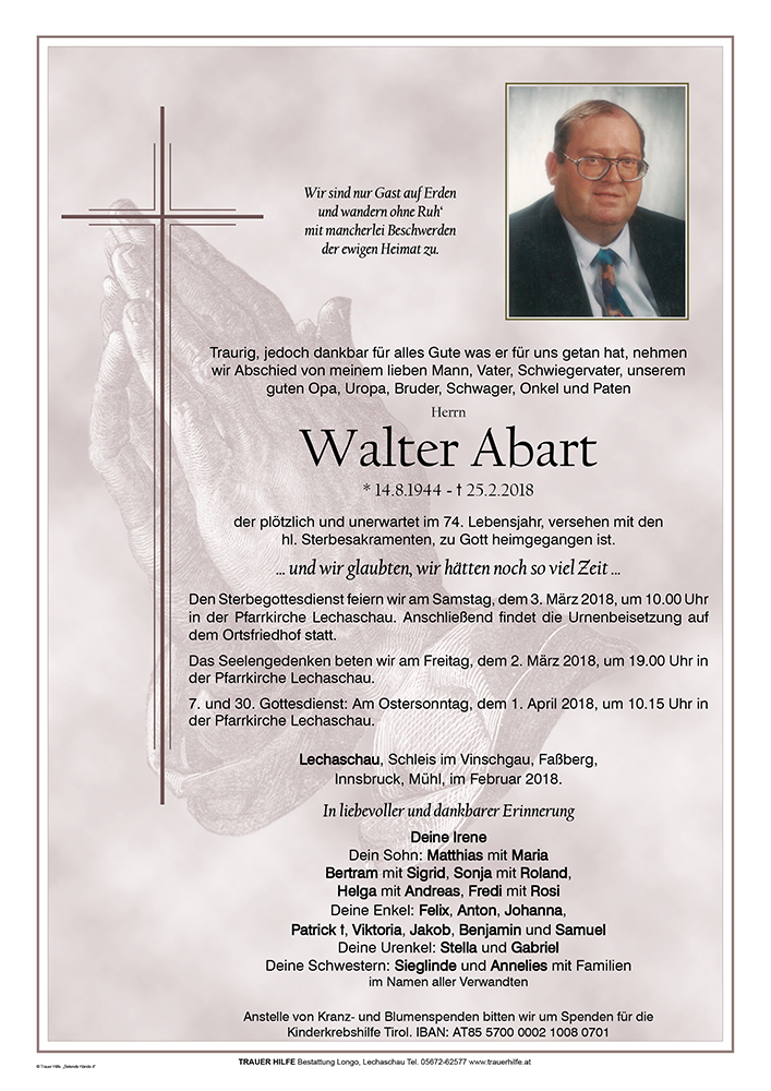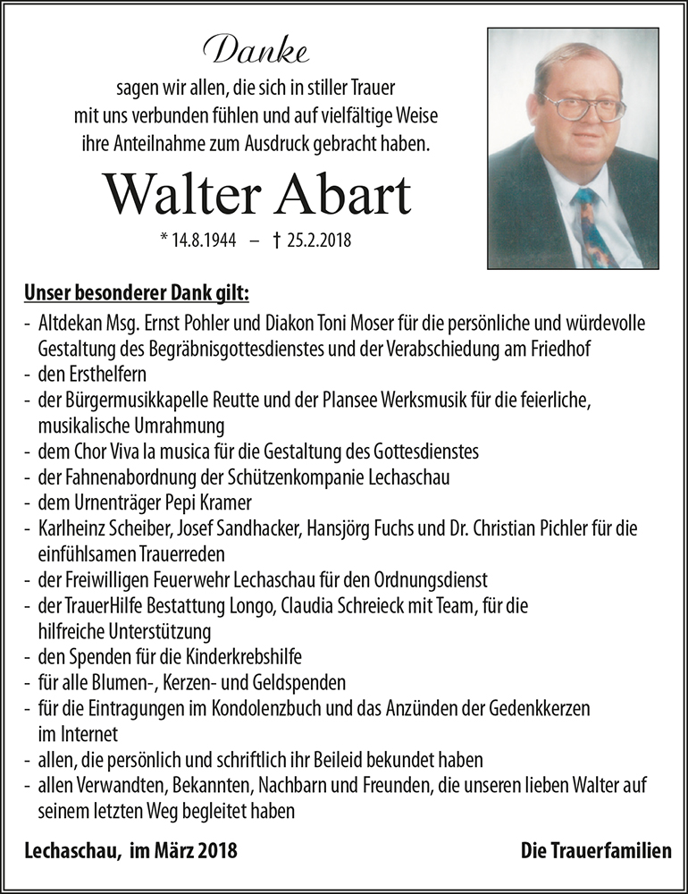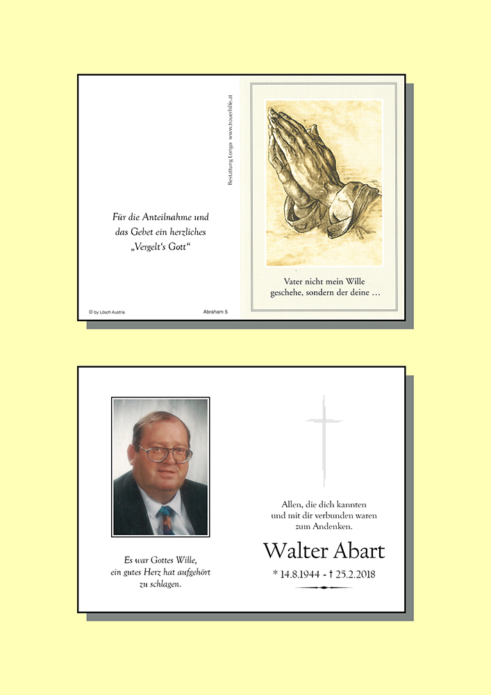 Werte Trauerffamilie! Mit zu Herzen gehender Betroffenheit habe ich vom Ablèben des so sehr geschätzten Herrn Abart Kenntnis nehmen müssen! Nichts mag unsere Trauer trösten, doch sein so einzigarziger, von seiner Liebe zu den Mitmenschen geprägter Humor wird uns ewig in Erinnerung bleiben, ja ewiig, weil wir uns allebeinmal im Himmel wiedersehen werden! In Verbeugung vor seinem Lebenswerk und seiner alles durchdringenden Herzlichkeit schließe ich mich Euren Gebeten an! Bernhard Bischof