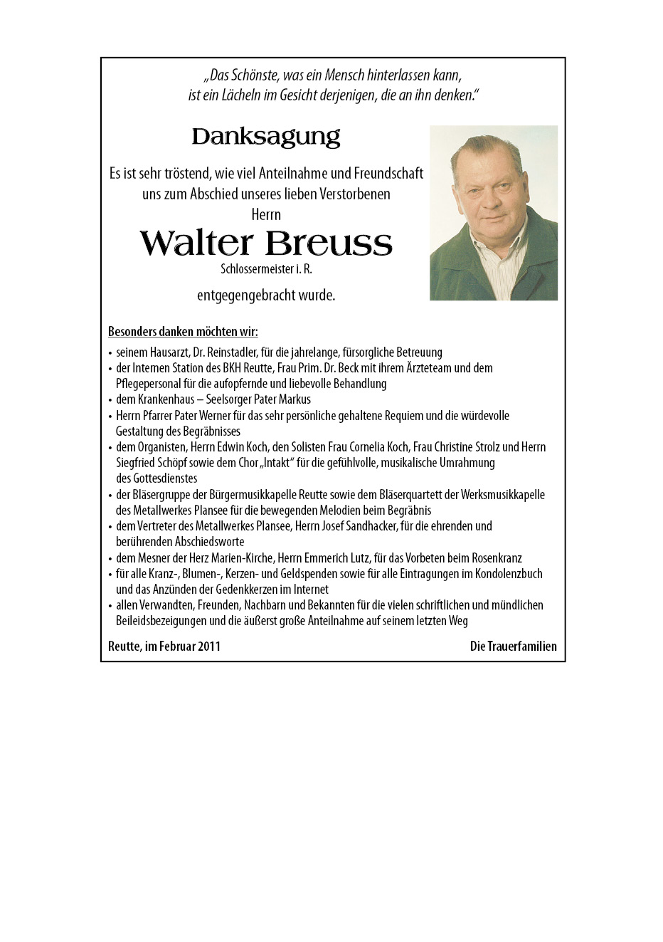 13.12.1901 11.01.2011 Reutte Walter Breuss Action Parte Sterbebild Gedenkkerzen Kondolenzen Danksagung Jahrestag Parte Sterbebild Gedenkkerzen Kondolenzen Danksagung Jahrestag Parte herunterladen Sterbebild herunterladen Gedenkkerzen für Walter Breuss 24 Einträge Kerze anzünden Lisi, Thomas und Otto a Lichtle für di für unseren lieben Nachbarn ein Licht für Dich unserem lieben Nachbarn wir reden und denkenk Ein Licht für dich für unseren lieben Nachbarn Ein Licht für dich! In lieber Erinnerung für unseren lieben Nachbarn Traute mit Familie Für dich lieber Walter ein Licht für unseren Nachbar für unseren lieben Nachbar ein Licht von Otto Simoner Harald für unseren lieben Nachbarn Erika Ernst Fam. Bernhard Zaggl Lisi, Thomas und Otto Fam. Kößler Werner u. Karin In stillem Gedenken In stillem Gedenken Ihre Gedenkkerze fürWalter Breuss Ihr Name* Farbe auswählen Ihre Nachricht oder Name* E-Mail-Adresse* Mit dem Klicken auf "Kerze anzünden" erklären Sie sich mit unseren Datenschutzbestimmungen einverstanden. Kondolenzbuch für Walter Breuss 0 Einträge Kondolenz verfassen Ihr Abschiedsgruß an Walter Breuss Ihr Name* E-Mail-Adresse* Ihre Nachricht* Mit dem Klicken auf "Gruß absenden" erklären Sie sich mit unseren Datenschutzbestimmungen einverstanden. Danksagung herunterladen Jahrestag herunterladen