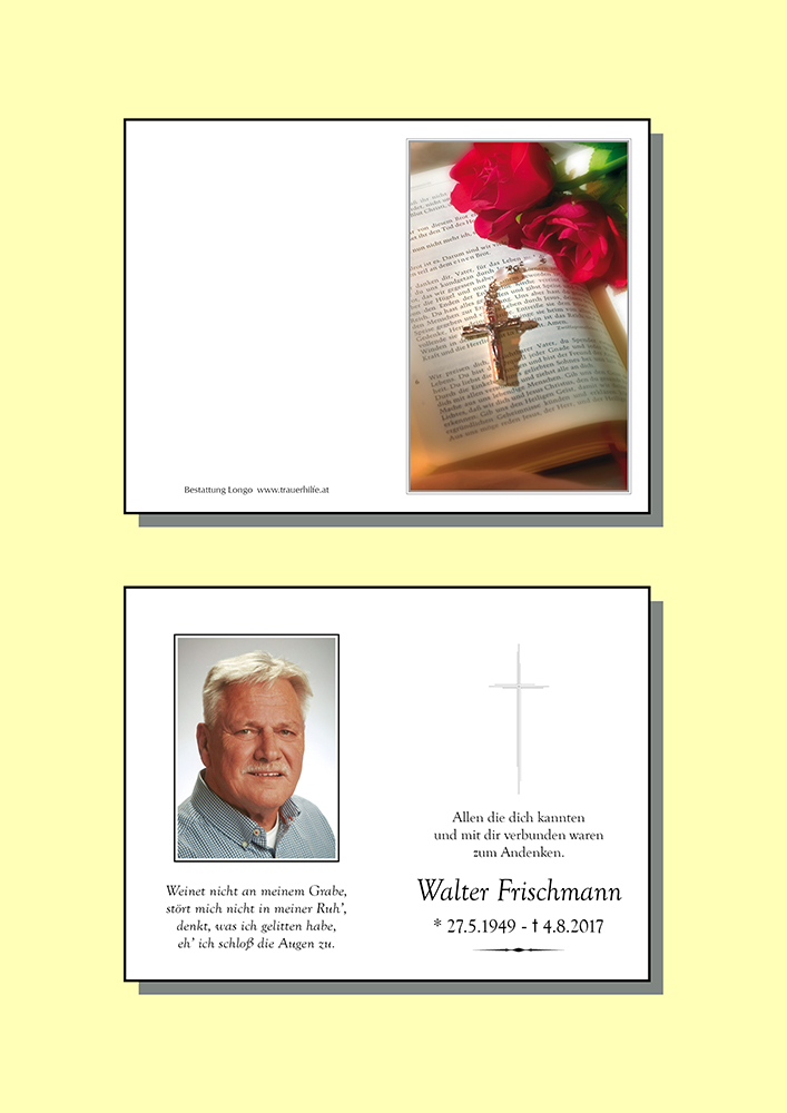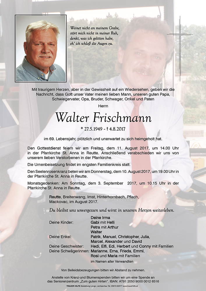 Lieber Walter vielen Dank für Deine schöne Fahrten im Schülerbus ( zw) du hattest immer ein offenes Ohr für uns. Nun muss ich vernehmen das du nun an einem vielleicht besseren Ort bist der einzige gute Gedanke dabei ist das dieses ohne leid und Schmerz ist. Mit der Hoffnung du wächst nun über deine liebsten.