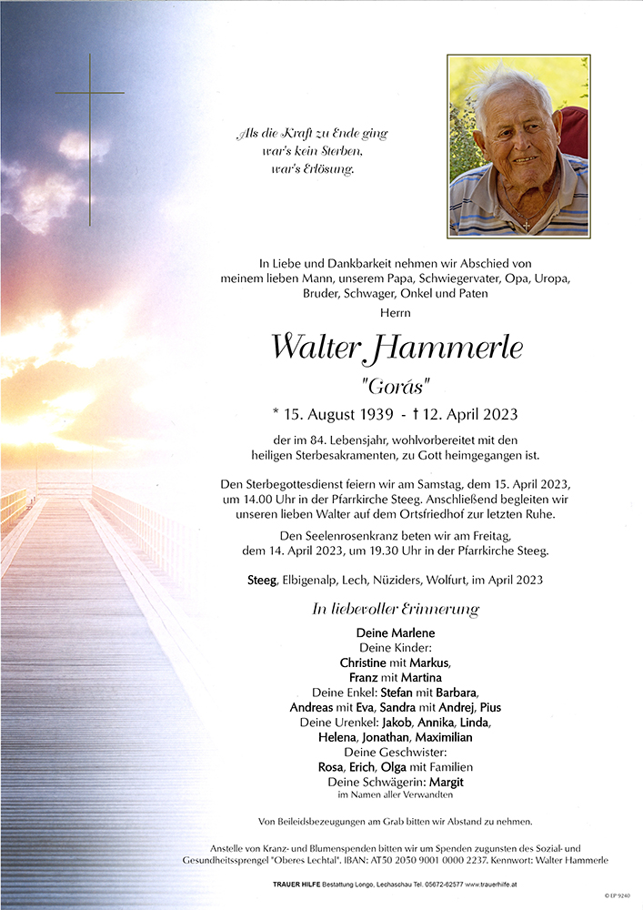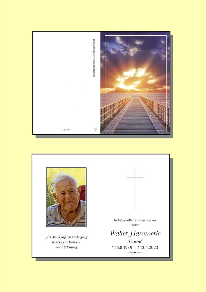 „Dunkel ist es nun um dich, von Stund an tragen wir dein Licht.“ „Ein ewiges Rätsel ist das Leben – und ein Geheimnis bleibt der Tod.“ „Erinnerungen, die unser Herz berühren, gehen niemals verloren.“ „Für uns ist es der Sonnenuntergang, für Dich aber ein Aufgang.“