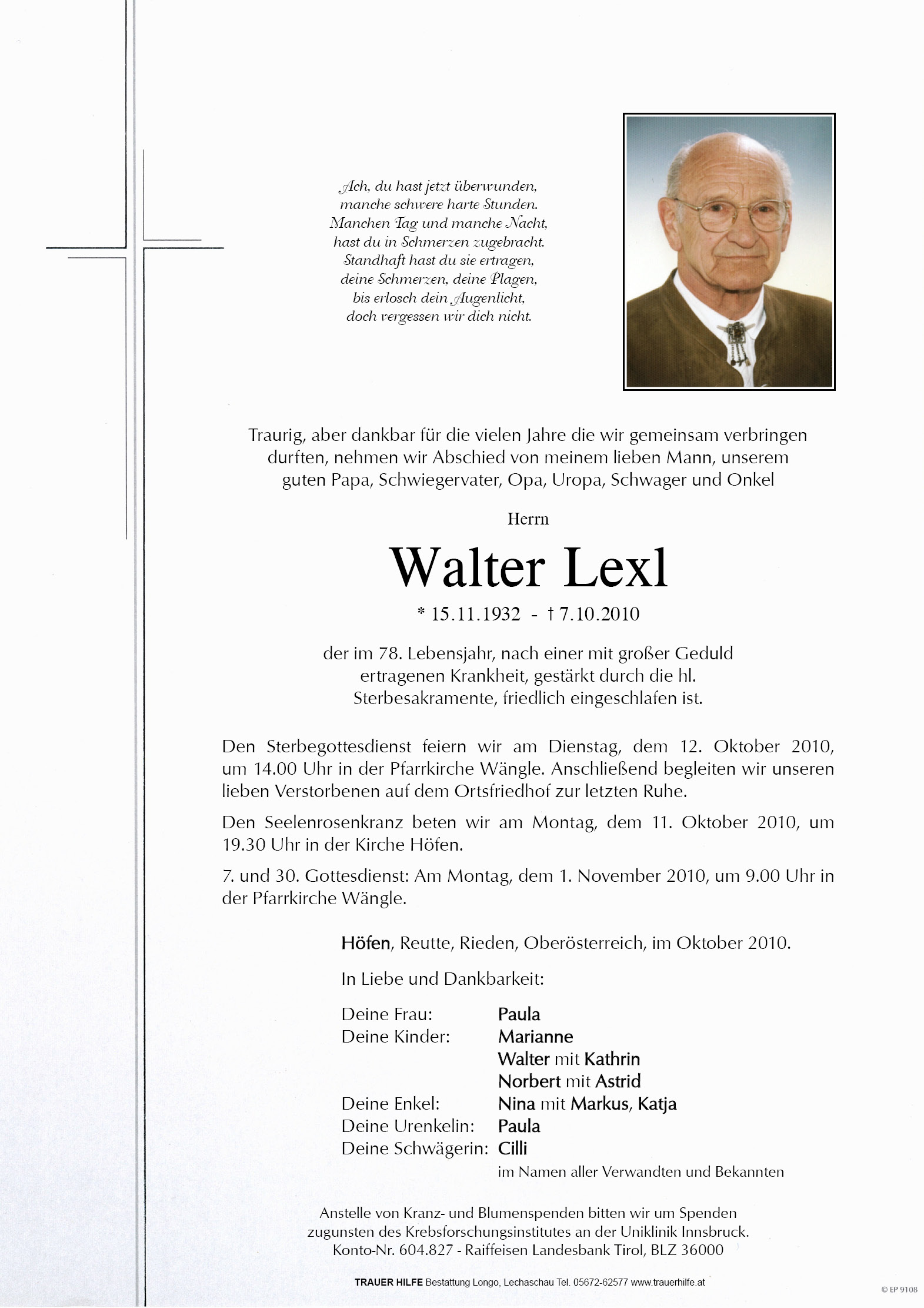 13.12.1901 07.10.2010 Höfen Walter Lexl Action Parte Sterbebild Gedenkkerzen Kondolenzen Parte Sterbebild Gedenkkerzen Kondolenzen Parte herunterladen Sterbebild herunterladen Gedenkkerzen für Walter Lexl 4 Einträge Kerze anzünden Babsi u. Heinz Walter Fam. Günter und Gitti Muglach Kathrin Ihre Gedenkkerze fürWalter Lexl Ihr Name* Farbe auswählen Ihre Nachricht oder Name* E-Mail-Adresse* Mit dem Klicken auf "Kerze anzünden" erklären Sie sich mit unseren Datenschutzbestimmungen einverstanden. Kondolenzbuch für Walter Lexl 0 Einträge Kondolenz verfassen Ihr Abschiedsgruß an Walter Lexl Ihr Name* E-Mail-Adresse* Ihre Nachricht* Mit dem Klicken auf "Gruß absenden" erklären Sie sich mit unseren Datenschutzbestimmungen einverstanden.