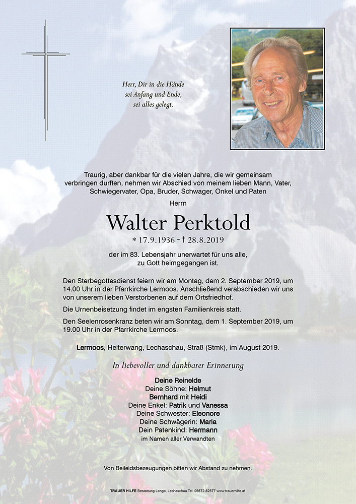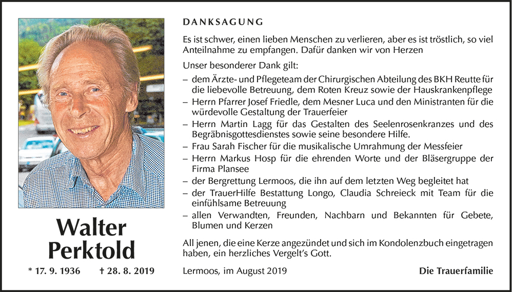 Innigst möchten wir euch auf diesem Wege unser aufrichtiges Beileid entbieten. Es ist immer zu früh einen geliebten Menschen zu verlieren, mögen die schönen Erinnerungen an euren Walter euch in der schweren Zeit der Trauer und des Loslassens Kraft schenken.