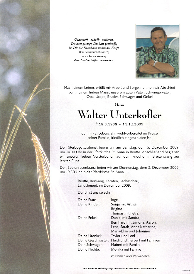 13.12.1901 01.12.2009 Reutte Walter Unterkofler Action Parte Gedenkkerzen Kondolenzen Parte Gedenkkerzen Kondolenzen Parte herunterladen Gedenkkerzen für Walter Unterkofler 4 Einträge Kerze anzünden Opa. Du fehlst uns. Du fehlst Deine Enkelin Lena In Erinnerung - Robert Klotz Ihre Gedenkkerze fürWalter Unterkofler Ihr Name* Farbe auswählen Ihre Nachricht oder Name* E-Mail-Adresse* Mit dem Klicken auf "Kerze anzünden" erklären Sie sich mit unseren Datenschutzbestimmungen einverstanden. Kondolenzbuch für Walter Unterkofler 0 Einträge Kondolenz verfassen Ihr Abschiedsgruß an Walter Unterkofler Ihr Name* E-Mail-Adresse* Ihre Nachricht* Mit dem Klicken auf "Gruß absenden" erklären Sie sich mit unseren Datenschutzbestimmungen einverstanden.