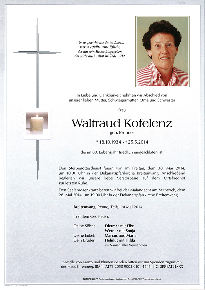 Gedenkkerzen für Waltraud Kofelenz