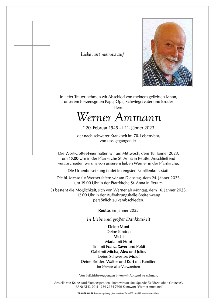 Mein tiefes Mitgefühl gilt der Familie und den Freunden in der Zuversicht, dass Werner nicht von uns, sondern vor uns gegangen ist.