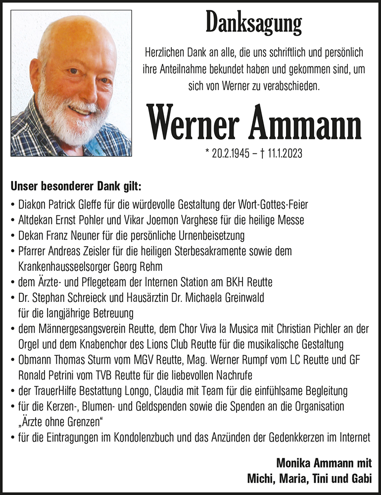 Ein bekannter Wirt in Reutte gab mir einmal den freundschaftlichen Rat, "Wenn du in einer öffentlichen Veranstaltung sprechen musst, wo der Werner Ammann ist, dann sprich vor ihm, danach ists unglaublich schwer, weil der Redet so gut". Lieber Werner, dieses Talent und deine verbindende, aber trotzdem geradlinige Art, konnte ich dann lange Jahre, in denen wir zwei für die Organisation des Reuttener Marktfestes verantwortlich waren, geniessen. Trotz manch harter Nuß die zu knacken war, blieb immer deine verbindende zu höchst höfliche Art dein Markenzeichen. Du warst ein Sir der besten Art, oft mein Vorbild. Liebe Trauerfamilie, erinnert euch mit Freude an den edlen Menschen, Werner.