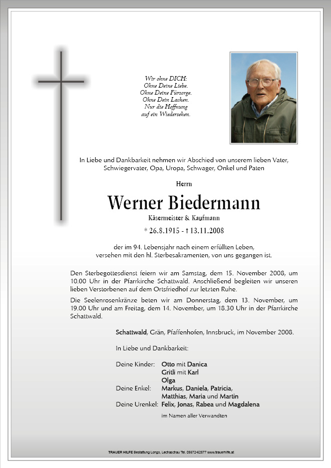 13.12.1901 13.11.2008 Schattwald Werner Biedermann Action Parte Gedenkkerzen Kondolenzen Parte Gedenkkerzen Kondolenzen Parte herunterladen Gedenkkerzen für Werner Biedermann 2 Einträge Kerze anzünden Petra Spannbauer mit Familie ?️? Ruhe in Frieden Ihre Gedenkkerze fürWerner Biedermann Ihr Name* Farbe auswählen Ihre Nachricht oder Name* E-Mail-Adresse* Mit dem Klicken auf "Kerze anzünden" erklären Sie sich mit unseren Datenschutzbestimmungen einverstanden. Kondolenzbuch für Werner Biedermann 0 Einträge Kondolenz verfassen Ihr Abschiedsgruß an Werner Biedermann Ihr Name* E-Mail-Adresse* Ihre Nachricht* Mit dem Klicken auf "Gruß absenden" erklären Sie sich mit unseren Datenschutzbestimmungen einverstanden.
