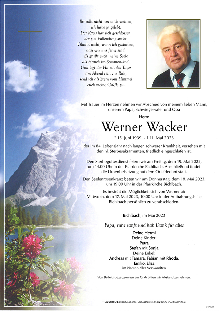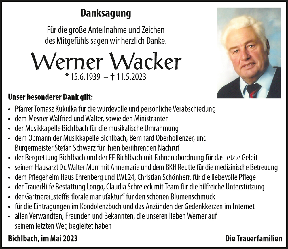 mit Werner verlieren wir ein langjähriges und verbundenes Mitglied der Zunftbruderschaft St. Josef zu Bichlbach. Wir werden Werner in besonderer Erinnerung behalten und ihm ein ehrendes Andenken bewahren. Unser tiefes Mitgefühl gilt seiner Familie und allen Angehörigen. In stiller Trauer und aufrichtiger Anteilnahme!