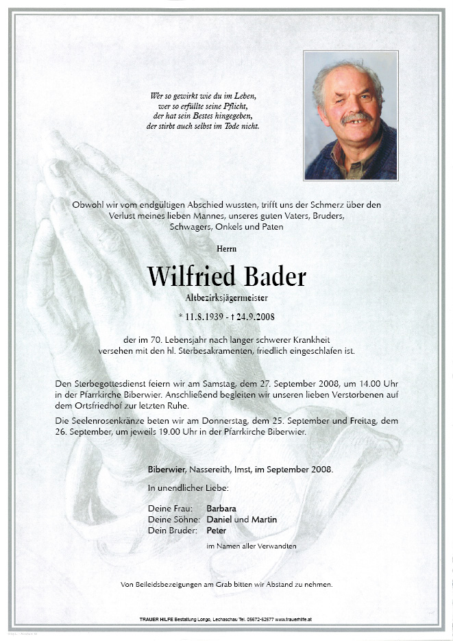13.12.1901 24.09.2008 Biberwier Wilfried Bader Action Parte Gedenkkerzen Kondolenzen Parte Gedenkkerzen Kondolenzen Parte herunterladen Gedenkkerzen für Wilfried Bader 12 Einträge Kerze anzünden Neujahrskerze für dich Ruhe in Frieden a lichtl a lichtl a licht für di a licht für di a licht für di Hosp Josef Hosp Josef hosp josef in stillem Gedenken hosp Josef Ihre Gedenkkerze fürWilfried Bader Ihr Name* Farbe auswählen Ihre Nachricht oder Name* E-Mail-Adresse* Mit dem Klicken auf "Kerze anzünden" erklären Sie sich mit unseren Datenschutzbestimmungen einverstanden. Kondolenzbuch für Wilfried Bader 0 Einträge Kondolenz verfassen Ihr Abschiedsgruß an Wilfried Bader Ihr Name* E-Mail-Adresse* Ihre Nachricht* Mit dem Klicken auf "Gruß absenden" erklären Sie sich mit unseren Datenschutzbestimmungen einverstanden.