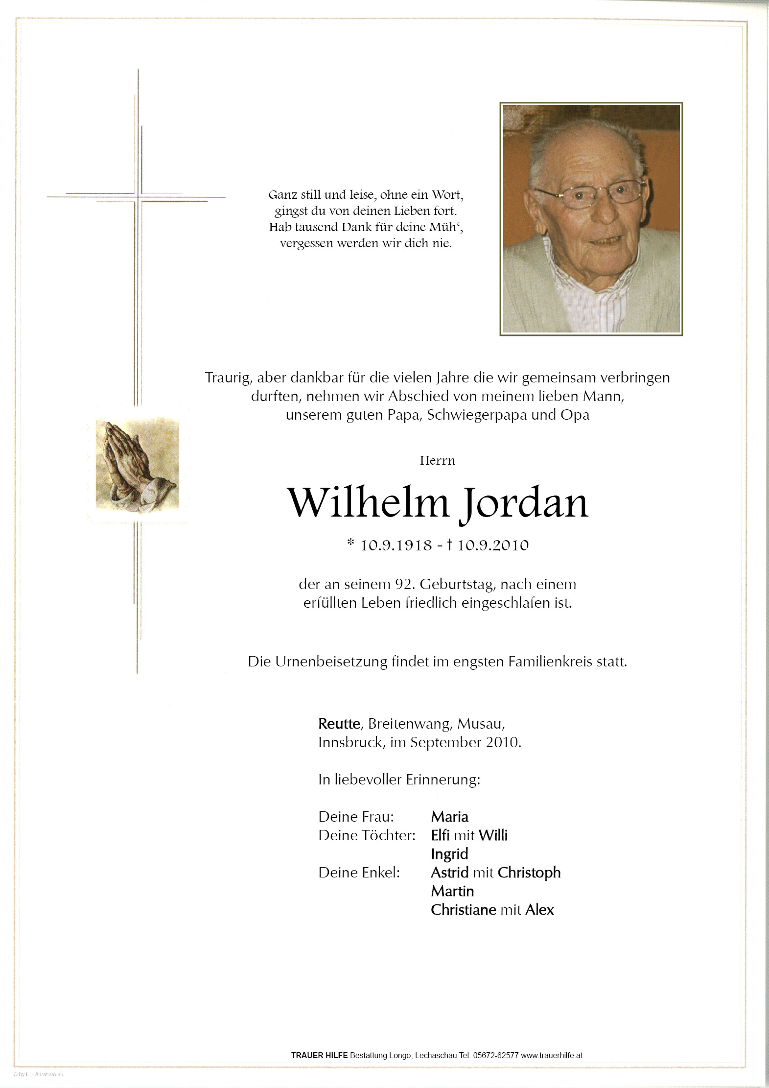 13.12.1901 10.09.2010 Reutte Wilhelm Jordan Action Parte Sterbebild Gedenkkerzen Kondolenzen Parte Sterbebild Gedenkkerzen Kondolenzen Parte herunterladen Sterbebild herunterladen Gedenkkerzen für Wilhelm Jordan 0 Einträge Kerze anzünden Ihre Gedenkkerze fürWilhelm Jordan Ihr Name* Farbe auswählen Ihre Nachricht oder Name* E-Mail-Adresse* Mit dem Klicken auf "Kerze anzünden" erklären Sie sich mit unseren Datenschutzbestimmungen einverstanden. Kondolenzbuch für Wilhelm Jordan 0 Einträge Kondolenz verfassen Ihr Abschiedsgruß an Wilhelm Jordan Ihr Name* E-Mail-Adresse* Ihre Nachricht* Mit dem Klicken auf "Gruß absenden" erklären Sie sich mit unseren Datenschutzbestimmungen einverstanden.