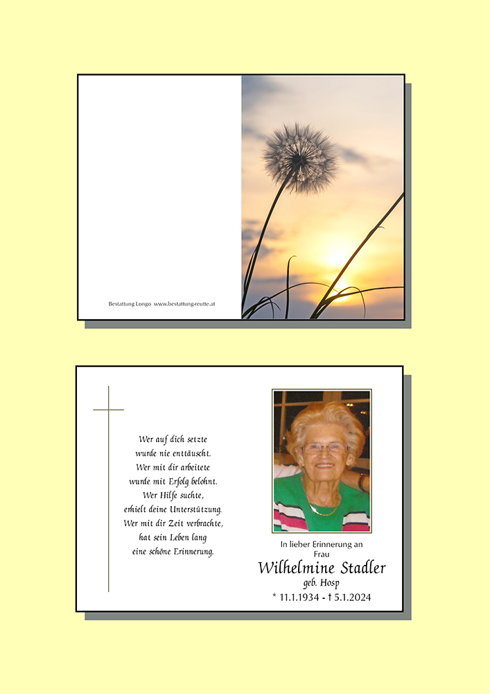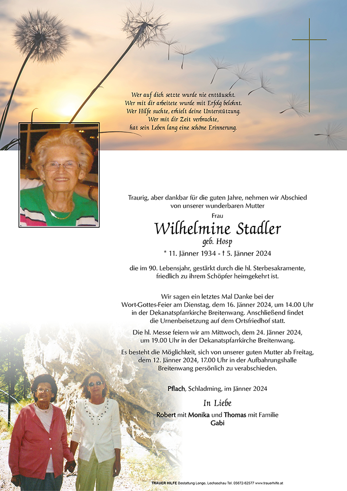 Viele Jahre habt ihr Stadlerkinder mit uns Weberkindern eure liebe Mama geteilt, wofür ich euch hier herzlich Danke sagen möchte! Unsere Dali oder Tali haben wir eure Mama genannt, weil wir Knirpse Frau Stadler noch nicht aussprechen konnten- dieser Name ist ihr geblieben. Sie war auch Teil unserer Familie, hat uns Jüngste begleitet von klein auf und bis wir erwachsen das Haus verlassen haben. Wir tragen viele schöne Erinnerungen an eure Mama in uns und werden sie nie vergessen. Ich wünsche euch Alles Liebe, Peter Weber