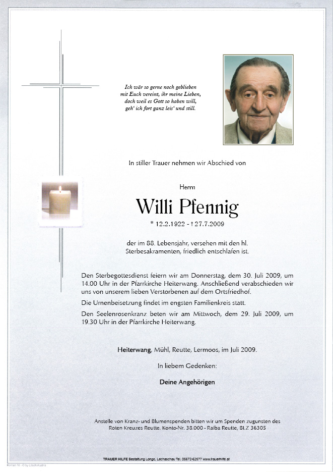 13.12.1901 27.07.2009 Heiterwang Willi Pfennig Action Parte Gedenkkerzen Kondolenzen Parte Gedenkkerzen Kondolenzen Parte herunterladen Gedenkkerzen für Willi Pfennig 1 Eintrag Kerze anzünden Katrin Ihre Gedenkkerze fürWilli Pfennig Ihr Name* Farbe auswählen Ihre Nachricht oder Name* E-Mail-Adresse* Mit dem Klicken auf "Kerze anzünden" erklären Sie sich mit unseren Datenschutzbestimmungen einverstanden. Kondolenzbuch für Willi Pfennig 0 Einträge Kondolenz verfassen Ihr Abschiedsgruß an Willi Pfennig Ihr Name* E-Mail-Adresse* Ihre Nachricht* Mit dem Klicken auf "Gruß absenden" erklären Sie sich mit unseren Datenschutzbestimmungen einverstanden.