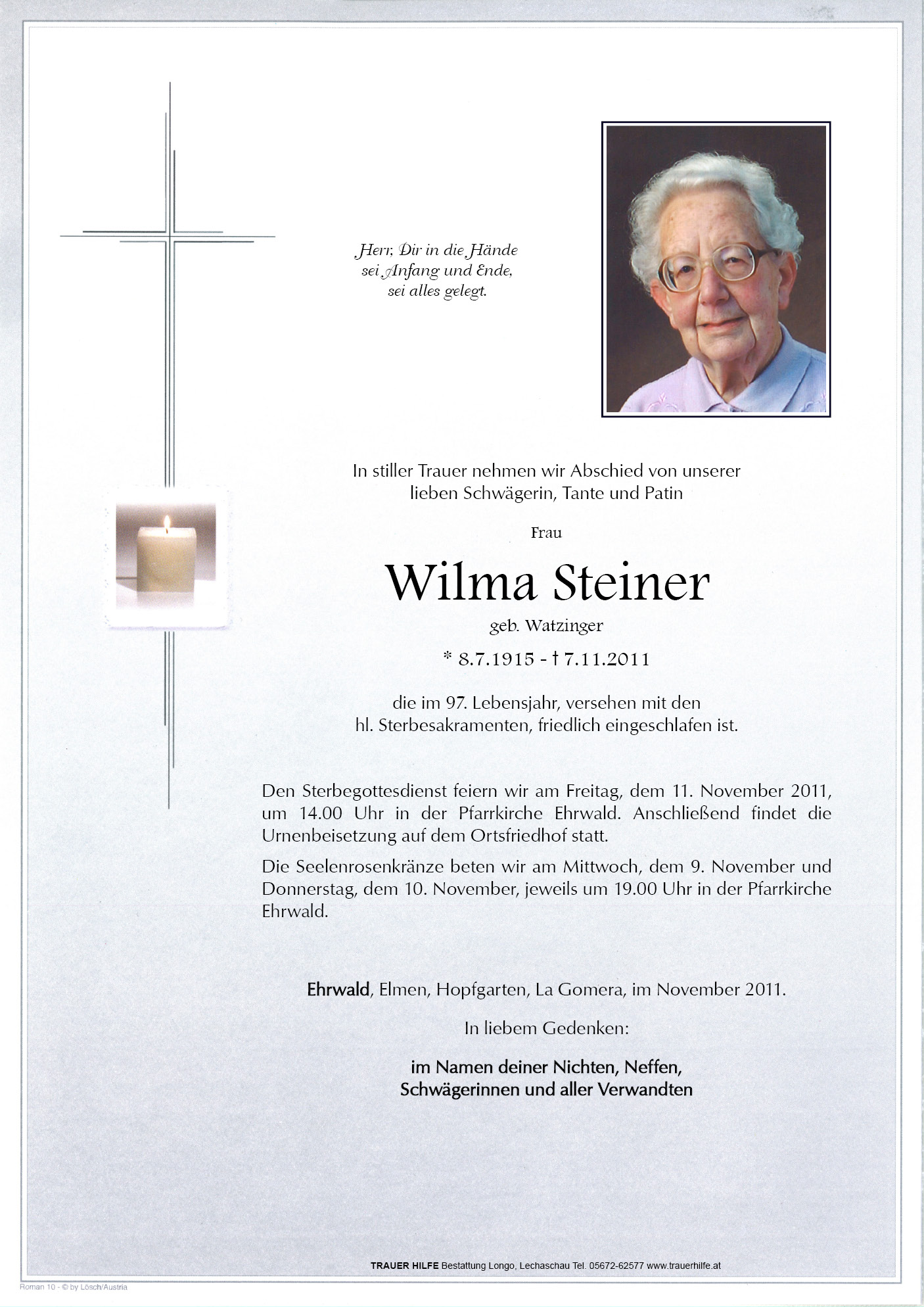13.12.1901 07.11.2011 Ehrwald Wilma Steiner Action Parte Sterbebild Gedenkkerzen Kondolenzen Parte Sterbebild Gedenkkerzen Kondolenzen Parte herunterladen Sterbebild herunterladen Gedenkkerzen für Wilma Steiner 4 Einträge Kerze anzünden A Lichtle auf Dein Weg . Agi Keller . ruhe in Frieden Ruhe in Frieden Fam. Donner Ihre Gedenkkerze fürWilma Steiner Ihr Name* Farbe auswählen Ihre Nachricht oder Name* E-Mail-Adresse* Mit dem Klicken auf "Kerze anzünden" erklären Sie sich mit unseren Datenschutzbestimmungen einverstanden. Kondolenzbuch für Wilma Steiner 0 Einträge Kondolenz verfassen Ihr Abschiedsgruß an Wilma Steiner Ihr Name* E-Mail-Adresse* Ihre Nachricht* Mit dem Klicken auf "Gruß absenden" erklären Sie sich mit unseren Datenschutzbestimmungen einverstanden.