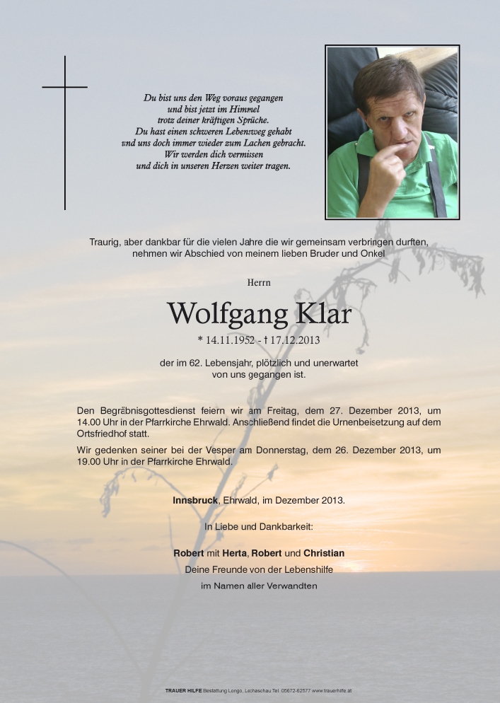 Ich möchte euch mein tiefes Beileid zum Ableben eures lieben Wolfgang aussprechen.