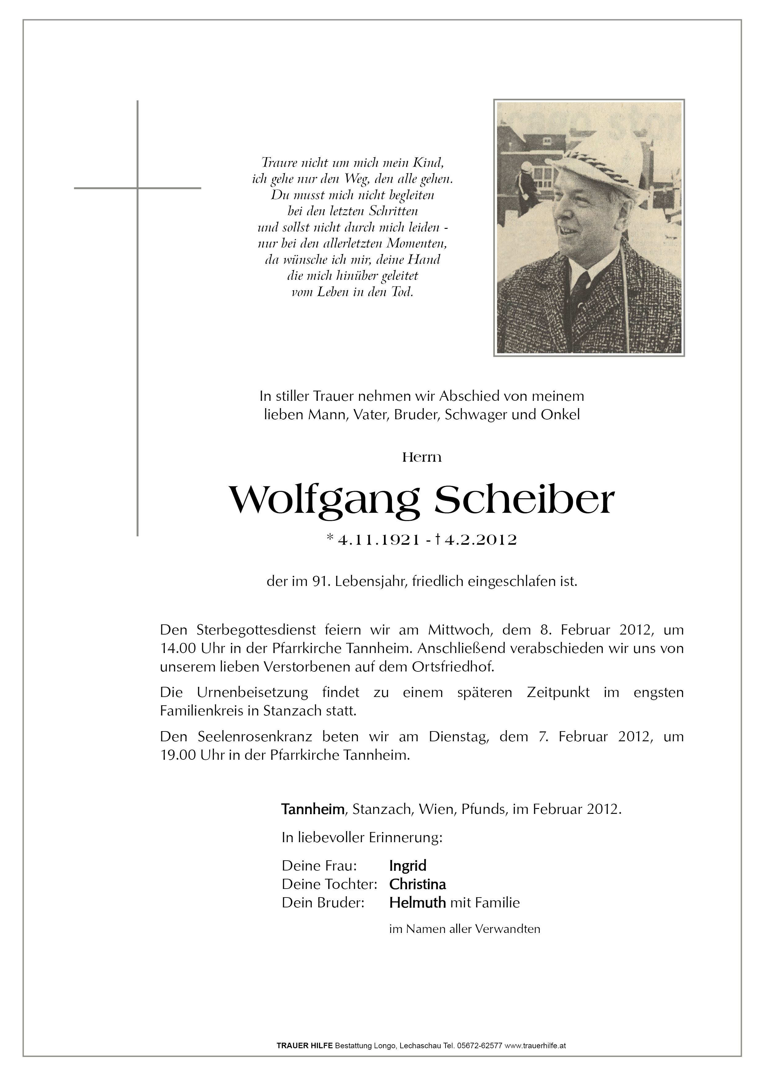 Für mich war Wolfgang Scheiber einer jener Menschen, der durch sein vielseitiges, unermüdliches Wirken in vielen Vereinen und Organisationen und vor allem als hervorragender Tourismuspionier unauslöschliche Spuren in der "Ausserferner Wirtschafts- und Zeitgeschichte" hinterlassen hat. In den Herzen vieler Menschen - so auch in meinem - leben auch unauslöschlich seine besinnlichen Mundart-Gedichte am "Hüttefuir" ewig weiter.