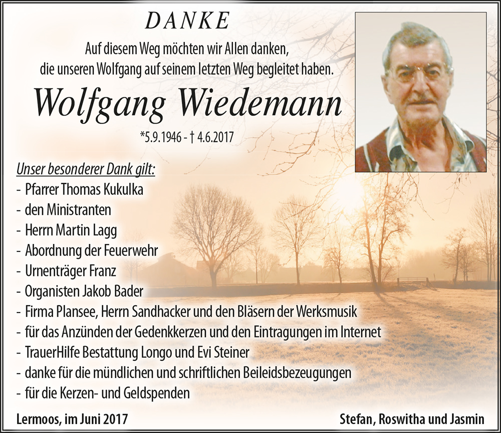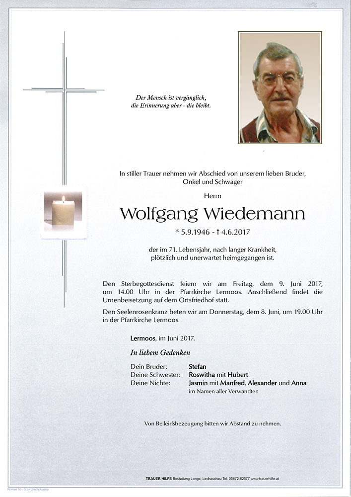 Jahrelang waren Wolfgang und ich gute Freunde. Während seiner langen Krankheit waren wir immer in Kontakt.Immer hatte er ein offenes Ohr für mich und ich für ihn.Sein plötzlicher tod schmerzt mich sehr.Pfiati Wolfgang