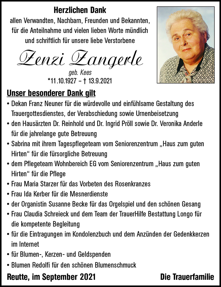 Liebe Zenzi, du hast mir so viel bedeutet im Leben, nun bist du angekommen. Vor nicht langer Zeit haben wir uns noch gesehen u. jetzt bis du gegangen ohne dass ich es wußte. Ich denke an dich u. mein herzl. Beileid gilt den Deinen.