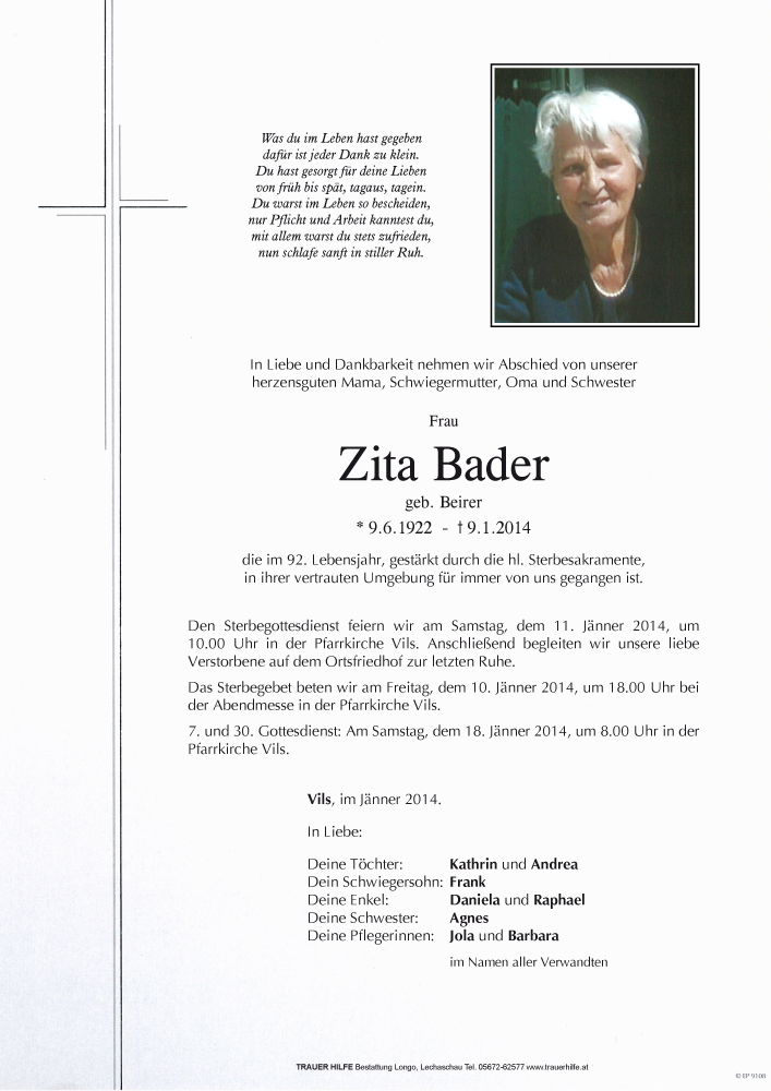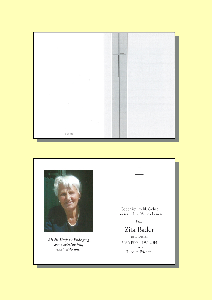 Kondolenzbuch für Zita Bader