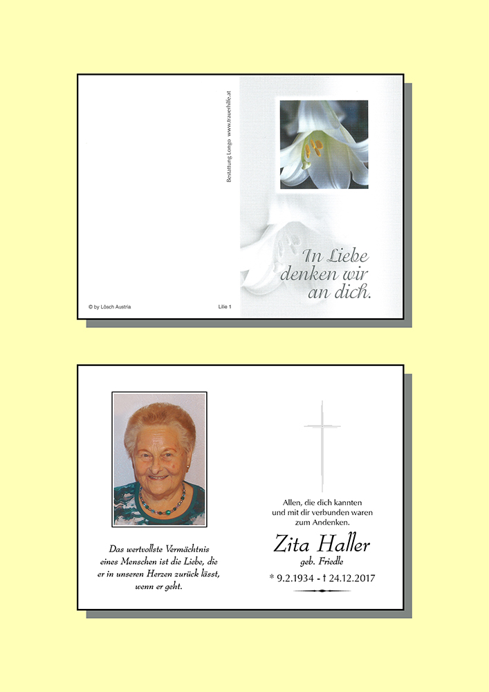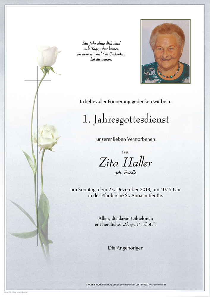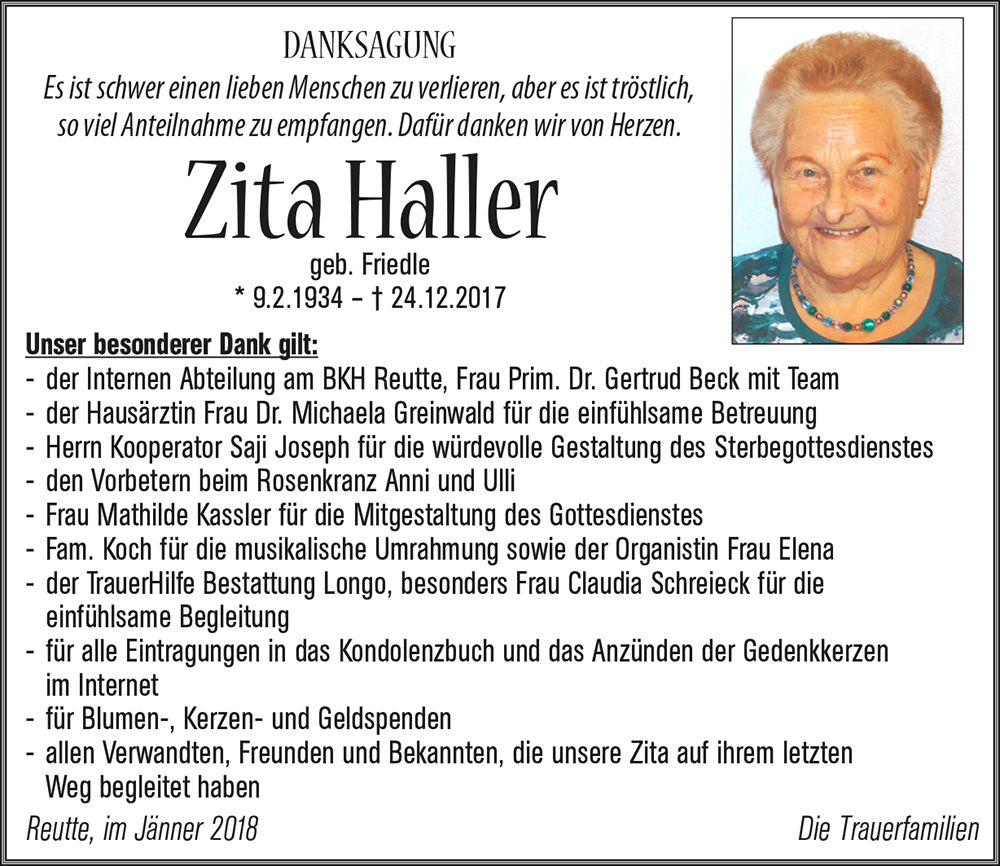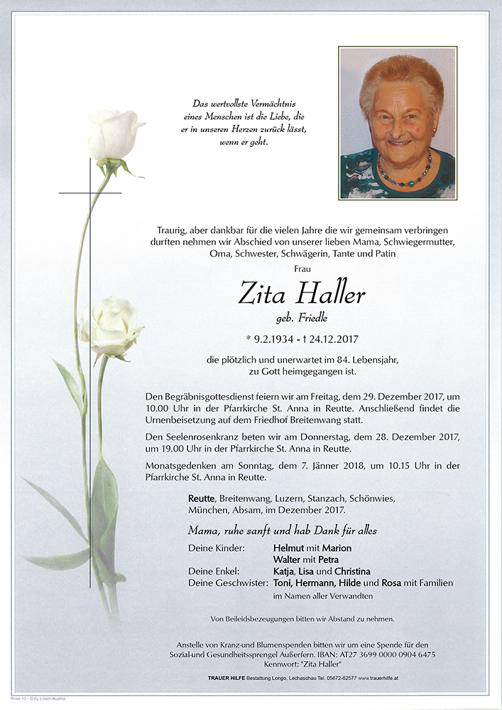 Bis 20.12. als Bettnachbarin Ihrer Mutter im Krankenhaus Reutte haben wir uns - soweit es möglich war - einiges aus unserem Leben erzählt und ich habe Ihre Mutter als tapfere und sehr gepflegte Frau kennengelernt. Umso trauriger stimmt es mich, dass Frau Haller bald danach diese Welt verlassen musste und ich möchte Ihnen meine aufrichtige Anteilnahme ausdrücken.