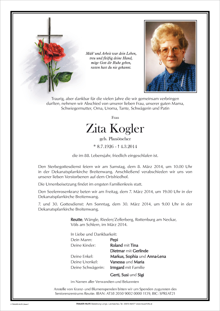 Mit Zita ist ein eifriges und für uns wertvolles Mitglied des 26er Jahrganges zu Gott berufen worden.